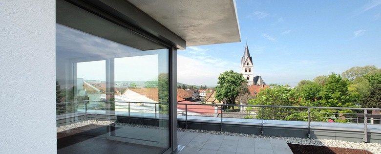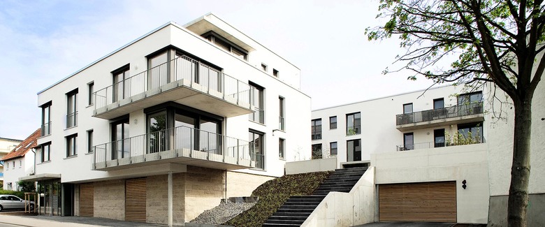 Treppen und Balkone wurden als Stahlbeton-Fertigteile vorgefertigt. Verwendung standardisierter Bauelemente: Standard-Aufzug in Glasschacht, Durch die Kompaktheit der Baukörper entsteht ein günstiges A/V-Verhältnis. Schlanke Wandkonstruktionen erzeugen eine hohe Flächeneffizienz. Je Treppenhaus/Aufzug und Geschoss werden effizient 3 Wohneinheiten erschlossen. In der Planung wurde die Topografie ausgenutzt indem das Tiefgeschoss talseitig ebenerdig und bergseitig überdeckt wurde. Dies reduziert Aushub und Gründung