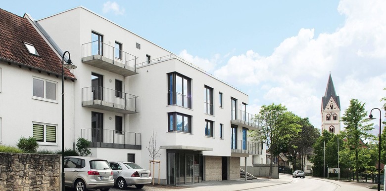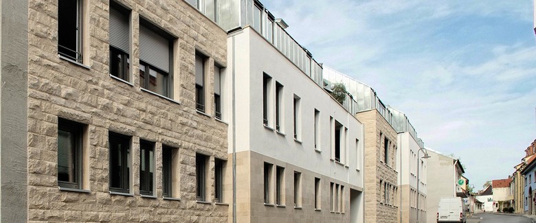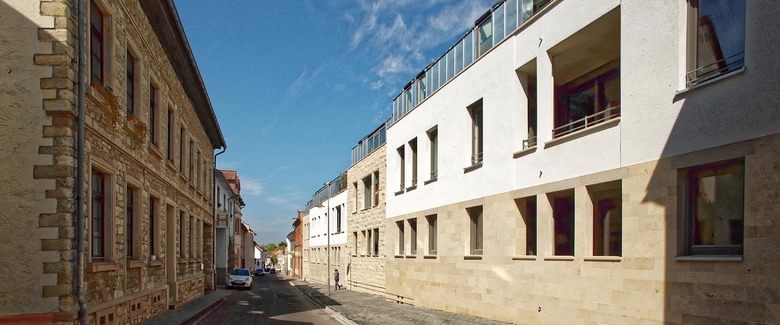 Die Gebäude fügen sich in den historischen Kontext und beziehen sich hinsichtlich Fassadenmaterial (Mineralischer Putz/Muschelkalkmauerwerk), Fenstergröße und Dachneigung auf den Bestand (ehem. Gasthof mit Bruchsteinfassade von 1871 in der Mainzer Str. und romanische Remigiuskirche an der Ottonenstraße).