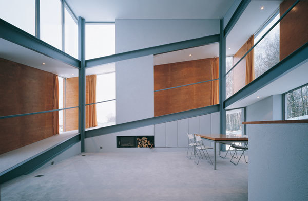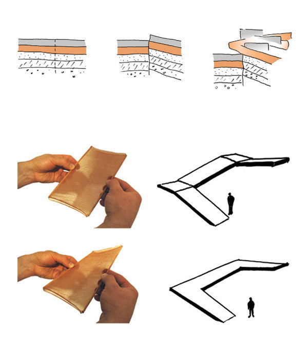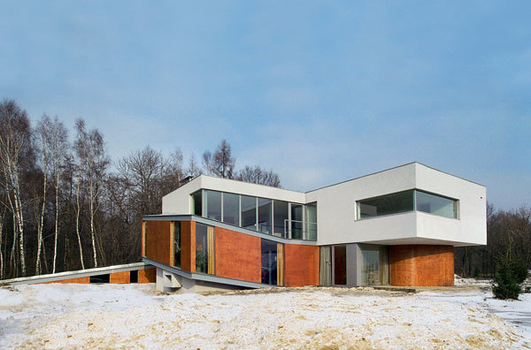 The building is located on the outskirts of Katowice, on a land deteriorated by 4th category mining damage, where tectonic faults are a possibility. Hence the connotation of uplifted layers of soil, interwoven with one another, which was the inspiration for the form of the house. Its structural design comprises rectangular solids contrasting with the ribbon-like structure, which winds around them after it emerges from the ground.