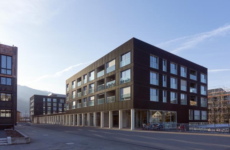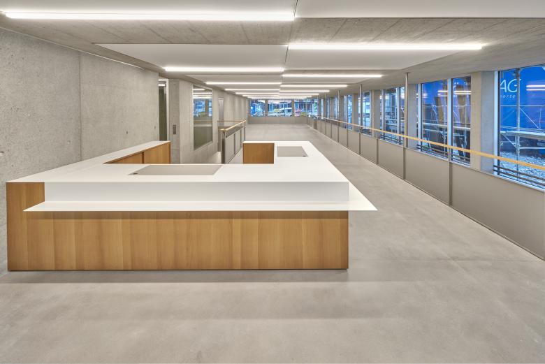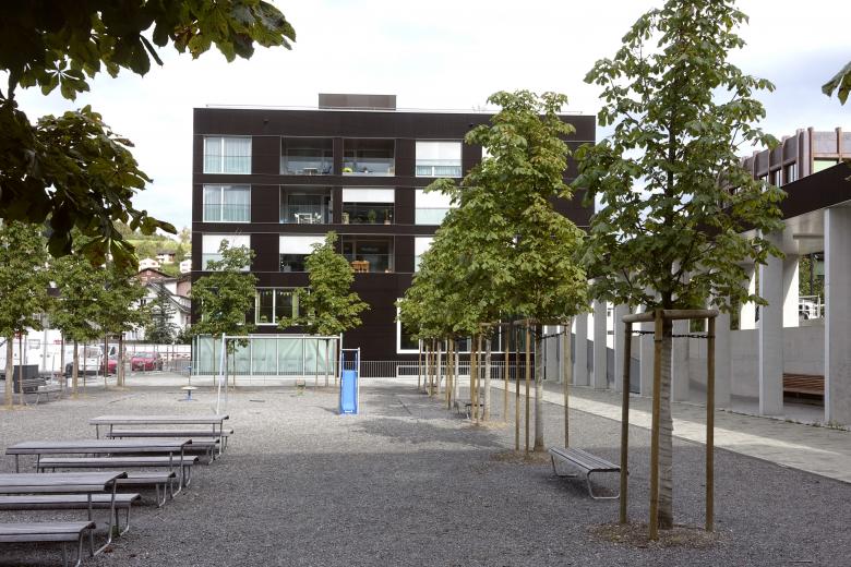 Die Überbauung Ortskern Horw ging aus einer Überarbeitung der bestehenden Bebauungsplanung hervor. Dieser war im Betrachtungsperimeter des Studienauftrags der Zentrumszone Bahnhof. Mit den beiden Genossenschaften Steinengrund und BG Familie aus Horw werden auf dem zuvor brachliegenden Areal zwischen Schulhaus, Horwerhalle und Gemeindehaus zwei Mehrfamilienhäuser mit vielfältiger Nutzung umgesetzt. Der sogenannte Kopfbau beherbergt die Musikschule und die Bibliothek der Gemeinde, sowie einen Mehrzwecksaal und zwei Spielgruppen. Im Untergeschoss findet zudem die Ludothek einen neuen Platz. In den Obergeschossen vermietet die Genossenschaft 15 Wohnungen. Im Ergänzungsbau gegenüber der Horwerhalle stehen im Sockelgeschoss Büros zur Vermietung und auch eine Kita wird hier untergebracht. In den Obergeschossen sind 19 Wohnungen geplant. Verbunden werden die beiden platzprägenden Bauten durch einen Arkadengang, der den neu entstandenen Freiraum fasst. Die zentrale Lage spricht Familien und Paare an, die urban und modern leben möchten. Die Wohnungen sind zeitgemäss und zurückhaltend ausgestattet. Sie verfügen über eine gedeckte Loggia, die auch an diesem belebten Ort Rückzugsmöglichkeiten bietet. Die Dachterrassen sind den Mietern vorbehalten und bieten ihnen so zusätzlichen Freiraum in einem städtischen Umfeld.