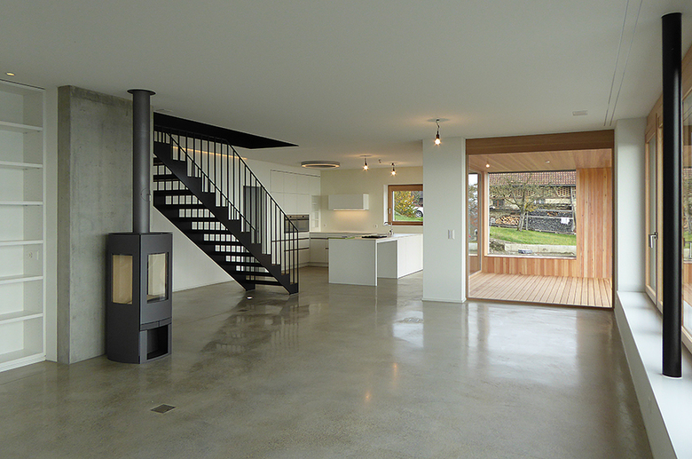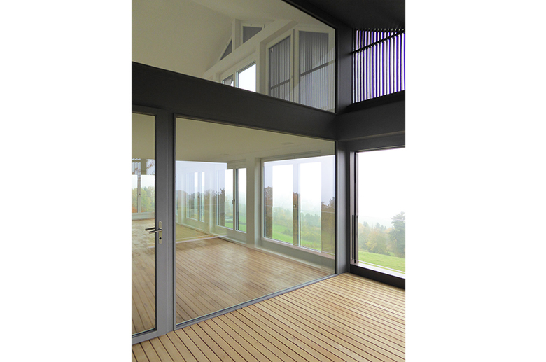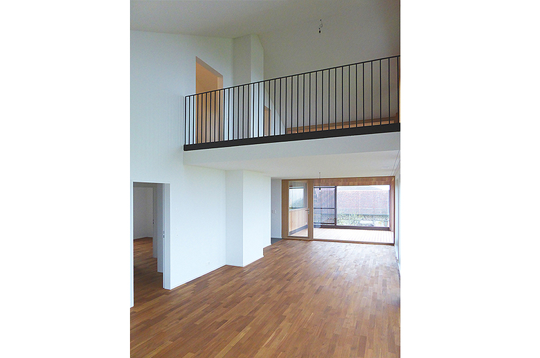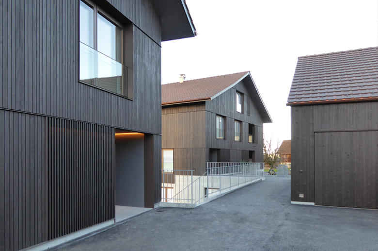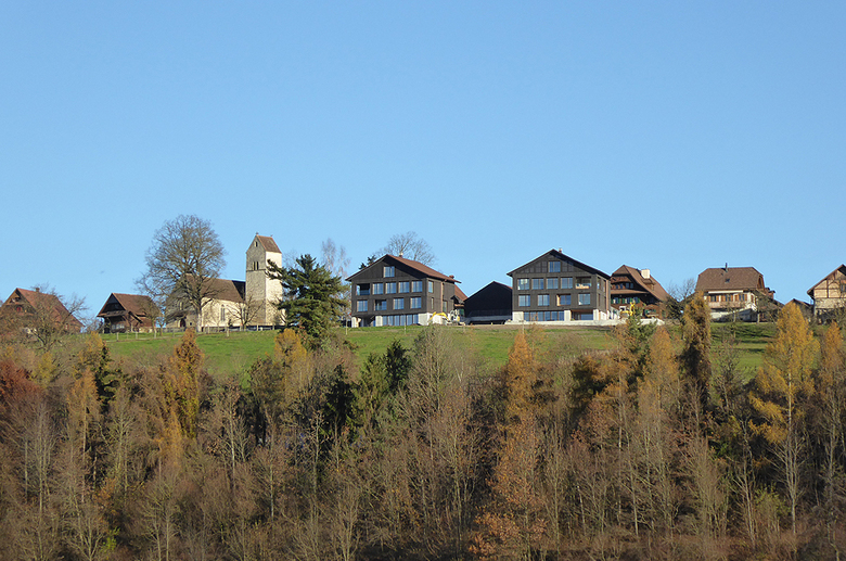 Der Weiler Kirchbühl, an erhöhter Lage über dem Sempachersee, ist ein schützenswertes Ortsbild von nationaler Bedeutung. Die Volumen sind entlang einem schmalen Strässchen aufgereiht, sie sind leicht zueinander verdreht, wie zufällig zusammengerückt, einzig die Firstrichtungen sind mit einer Ausnahme alle von Norden nach Süden gerichtet. Die Gebäude bilden eine hofartige Volumenkombination mit zwei Wohnhäusern und einem Schopf in Massivbauweise mit Holzverkleidung. Der Garagenschopf besetzt die Weggabelung und übernimmt die Lenkung des Blickes von Osten auf den Kirchhof. Die beiden neuen Wohnhäuser sind - wie die zwei bestehenden Häuser gegenüber - hinter Gärten, Vorplätzen und Hostet angeordnet. Geschützt zwischen den drei Volumen erlaubt die leichte Hanglage einen ebenen Hof und spielt das unterste Wohnniveau frei. Der Garagenschopf kann mit den beiden Kipptoren ganz geschlossen werden wie ein landwirtschaftliches Ökonomiegebäude. Ähnlich historischen Bauernhäusern aus der gleichen Region und Bauzeit basieren die beiden neuen Wohnhäuser auf einem gleichen Gebäudetyp. Unterschiede entstehen durch Variationen der inneren Aufteilung und der damit verbundenen Anordnung der Öffnungen und der Materialisierung der Loggias. Die Gebäude enthalten je zwei nabhängige Wohnungen. Die leichte Ausdrehung und Staffelung der beiden Wohnhäuser erlaubt die Aussicht auf die Innerschweizer Bergkette zwischen Rigi und Pilatus aus allen vier Wohnungen. Die vom Weiler abgewandten Südseiten sind grosszügig verglast. Die Maisonettewohnungen der beiden zukünftigen Eigentümer werden auf dem Erschliessungsniveau im Schlafgeschoss betreten. Grosszügige Treppenanlagen führen in die ebenerdigen Wohngeschosse. Die Mietwohnungen im Obergeschoss werden über eigene Treppen erschlossen. Um die Gebäudegrundfläche kompakt zu halten und die räumlichen Qualitäten einer unter dem Dach liegenden Wohnung auszunutzen, wird ein Zimmer im Dachgeschoss mit Galerie über eine Treppe erreicht.