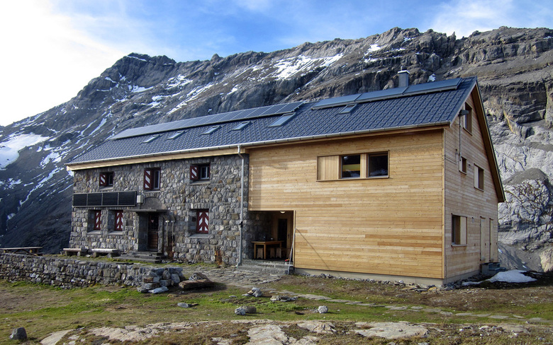 Dabei bleibt die ehemalige Aussenwand über alle drei Geschosse als Bruchsteinmauerwerk erhalten und macht den Übergang in die ursprüngliche Hütte erlebbar. Im Erdgeschoss befindet sich ein grosser, nach Süden ausgerichteter Aufenthaltsraum mit freistehendem Ofen. Auf der einen Seite schliesst die Terrasse an, gegenüber befindet sich im heutigen Schopf des Steinhauses die neue Küche. Im Erdgeschoss des Anbaus sind weitere Nebenräume und der Winterraum mit separatem Zugang untergebracht. Der Dachbereich wird über die gesamte Gebäudelänge zum grossen Schlafraum mit Zweierkojen. Im Obergeschoss des Anbau befindet sich die Wohnung des Hüttenwarts. Innen wie Aussen wird der Anbau mit einer Lärchenholzschalung verkleidet.