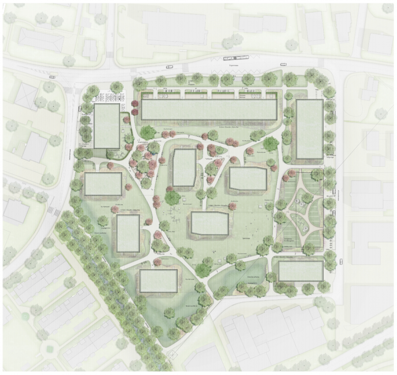 Die Parzelle wird mit einer aufgelösten Randbebauung entlang der Zuger,- Industrie und Allmendstrasse gefasst. Ein markanter Hochpunkt stärkt die Adressbildung und markiert den Siedlungseingang. Im grosszügigen zentralen Park sind stehen drei aufgelockerte kleinere Gebäudevolumen in Holz. Mit einem geschwungenen feinmaschigen Wegesystem durch den ruhigen Hofraum wird die Adressierung und eine allseitige Durchwegung geschaffen. Dank der verschiedenen Gebäudetypen kann eine Vielzahl von unterschiedlichen Wohntypologien angeboten werden wie auch der jeweiligen Aussenlärm- und Aussichtssituation entsprechen reagiert werden.
