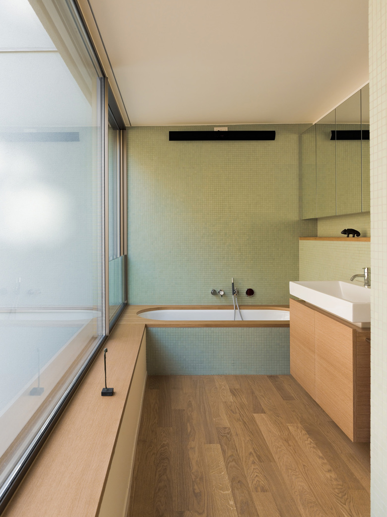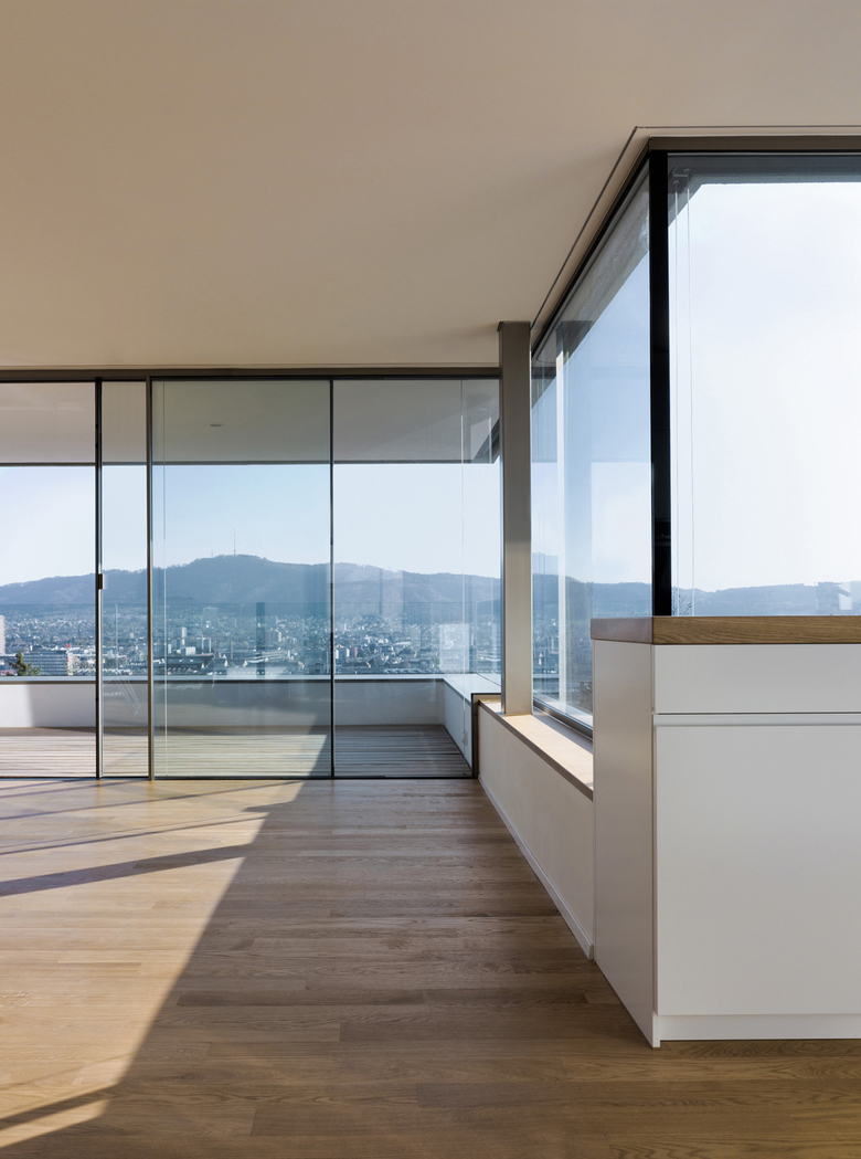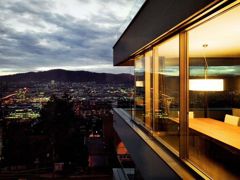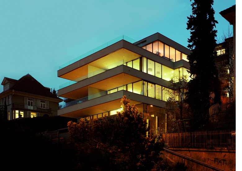 Im Zürcher Wohnquartier Höngg entand dieses Mehrfamilienhaus inmitten von Bürgerhäusern der 1930er-Jahre. Alle Bauten des Strassenabschnitts stehen leicht zurückversetzt auf einer Stützmauer am Hang und sind von einem Garten mit Büschen und Bäumen umgeben. Der grosse Neubau mit sechs Eigentumswohnungen im exklusiven Bereich nimmt die Massstäblichkeit der Nachbarbauten auf, indem sich die Gebäudekanten an den umgebenden Kubaturen orientieren. Die Rückseite des Gebäudes lehnt sich an den Hang an, in Richtung Ottenbergstrasse öffnet es sich mit auskragenden Balkonen. Die Rückseite des Gebäudes lehnt sich an den Hang an, in Richtung Ottenbergstrasse öffnet es sich mit auskragenden Balkonen. Den Auftakt zu den Wohnungen bildet ein höhlenartiges Treppenhaus aus Sichtbeton mit einem Boden aus Eichenparkett. Die Gestaltung und Materialisierung der 3 ½ – 6 ½-Zimmer-Wohnungen ist zurückhaltend und nobel, hier kommen warme Materialien wie geöltes Eichenholz zum Einsatz und schaffen eine sinnliche Wohnatmosphäre. Die grau-grünliche Farbe des Fassadenputzes und die bronzefarbenen Fenster wurden passend zu den Mauern, Verputzen und Fassadenelementen der Umgebung gewählt.