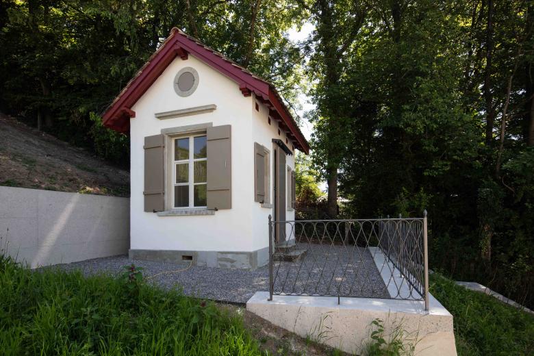 Die Parzelle am Steilhang an der Rychenbergstrasse befindet sich an sehr guter Wohnlage mit beeindruckender Weitsicht über Winterthur. Die Struktur des Quartiers ist eher heterogen, mit dem Rebhaus als wiederkehrendes Element. Der Neubau fügt sich in die vorhandene Struktur ein, respektiert das bestehende Schutzobjekt und bindet dieses im landschaftlichen Konzept mit ein.