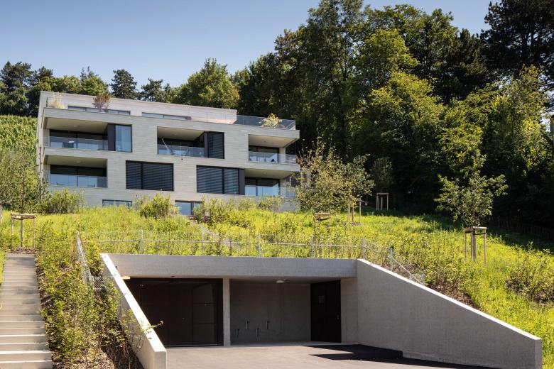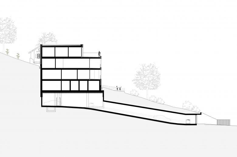Durch eine sorgfältige Platzierung des Neubaus, der möglichst wenige Abgrabungen bedingt, kann ein natürlicher Hangverlauf bestehen bleiben. Dies wird durch die im Volumen intergrierten privaten Freibereiche unterstützt.