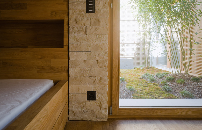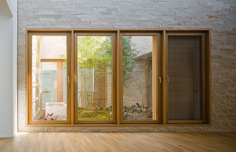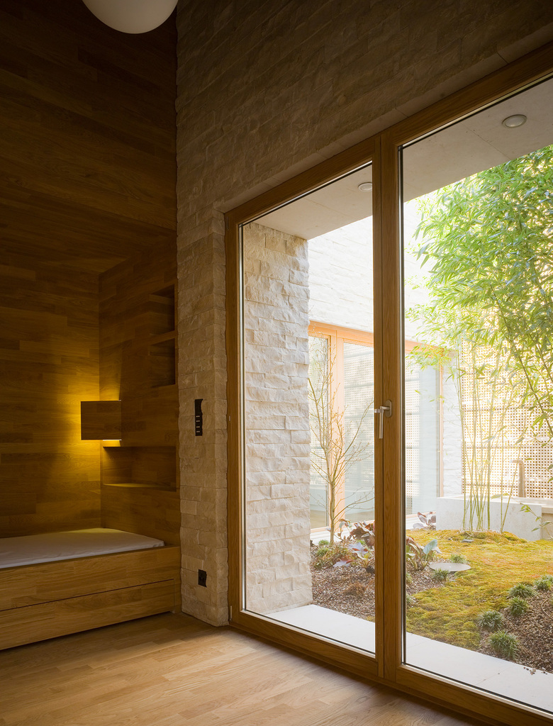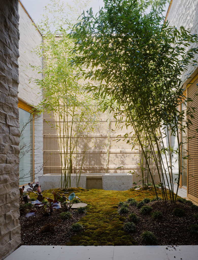 Eine Wohnung in einem Mehrfamilienhaus wurde zur Oase für den Bauherrn: Ein Patio inmitten der Wohnung, mit Bambusgarten und einem kleinen Schlafraum, bietet Ruhe und Geborgenheit inmitten der Stadt. Die Umfassungsmauern des Patios bestehen aus Kalkstein, seine Einbauten aus Eichenholz. Die warmen Materialien und die Grün- und Weisstöne des Gartens schaffen eine meditative Stimmung in diesem fast schalldichten Raum. Der Patio und die angrenzenden Wohnräume sind durch raumhohe Verglasungen getrennt. Bei Bedarf kann der Patio aber auch komplett isoliert werden, indem die Holzläden an den Fenstern verschlossen werden. Im Garten ist Wasser ein wichtiges Gestaltungselement. Ein Brunnen – wahlweise mit hörbarem oder leisem Zulauf – verstärkt die idyllische Atmosphäre.