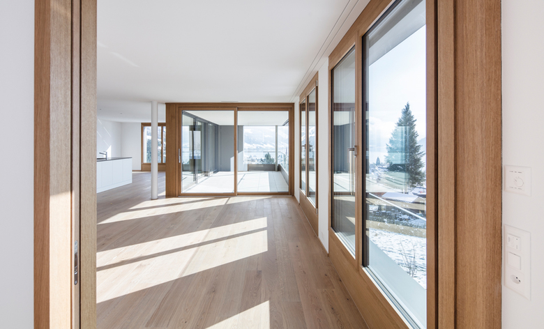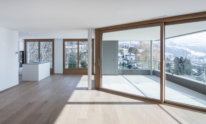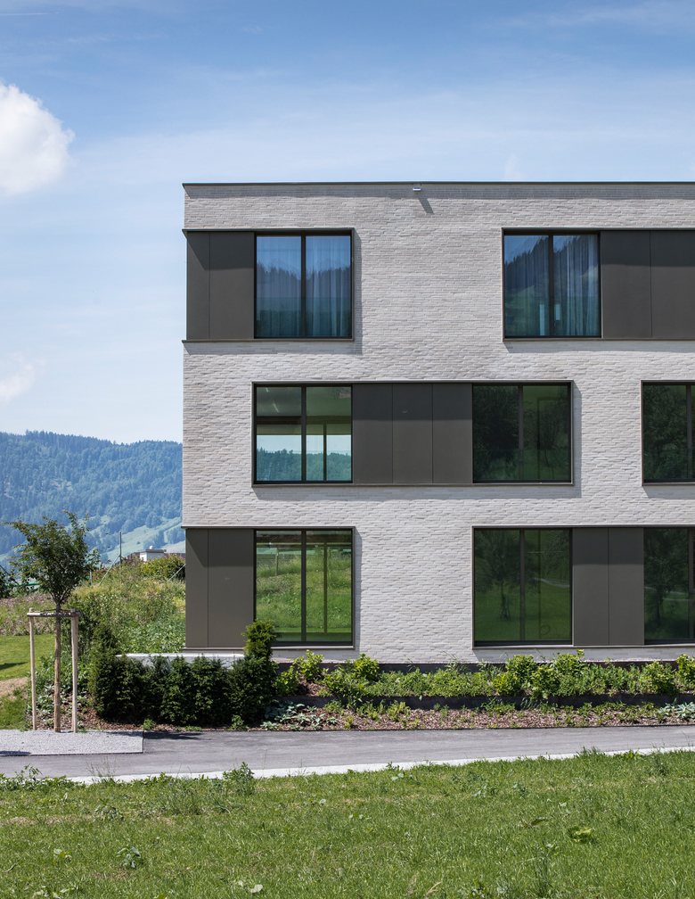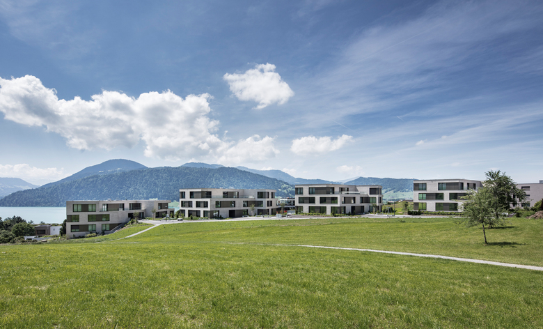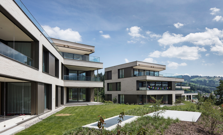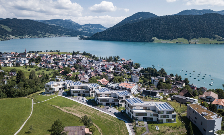 Die vier Baukörper verteilen sich gleichmässig über das Grundstück und folgen dem natürlich abfallenden Geländeverlauf. Die Formgebung der Gebäude vermittelt geschickt zwischen dem Charakter einer Arealbebauung und der Einzelbauweise der Umgebung. Dabei werden hofartige Situationen geschaffen. Auf der Nordseite dienen sie als Zugangsbereiche und im Süden als Gartenzone. Die geknickten Baukörper haben das Ziel eine möglichst grosse Abwicklung nach Süden mit Blick auf den See zu generieren. Die Faltung der Baukörper zu verkürzten Fassadenteilen bricht den Massstab und schafft eine Verwandtschaft zu den Einzelbebauungen der Nachbarschaft. Mit Hilfe der Fassadengestaltung und dem zurückknickenden Attikageschoss oszilliert das Gebäude zwischen einer Zwei- und Dreigeschossigkeit. Neben den Wohnbereichen mit Seesicht im Süden, orientiert sich eine Schlafzimmerschicht mit Ausblick ins Grüne richtung Norden. Die grosszügig geschnittenen Wohneinheiten weisen einen Mix von 3.5 bis 6.5 Zimmerwohnungen auf. Das Fassadenkonzept vermittelt zwischen den grossen Ausschnitten auf der Südseite und den kleineren Öffnungen auf der Nordseite durch das Zusammenfassen mehrerer Fenster zu einem Ausschnitt. Dabei wird mit Hilfe eines Materialwechsels eine mäandrierende Fassadenstruktur erzeugt die den Baukörper auflockert. Die hellen massiven Fassadenteile geben den Gebäuden einen freundlichen Charakter und verankern sie im Terrain.
