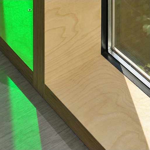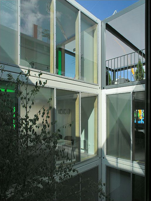 Abweichend von den üblichen Kunststoffenstern und Trapezblechen wurden die Fassaden im Bereich des Patios mit einer vollflächig verglasten Pfosten-Riegel-Konstuktion aus 50 mm starken Multiplex-Platten versehen. Durch den Patio drang das Licht tief in das Innere des Gebäudes ein.