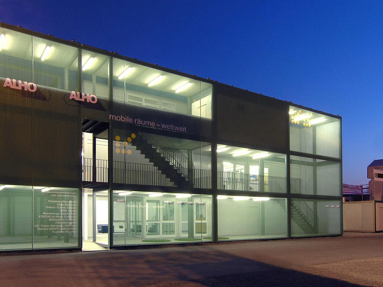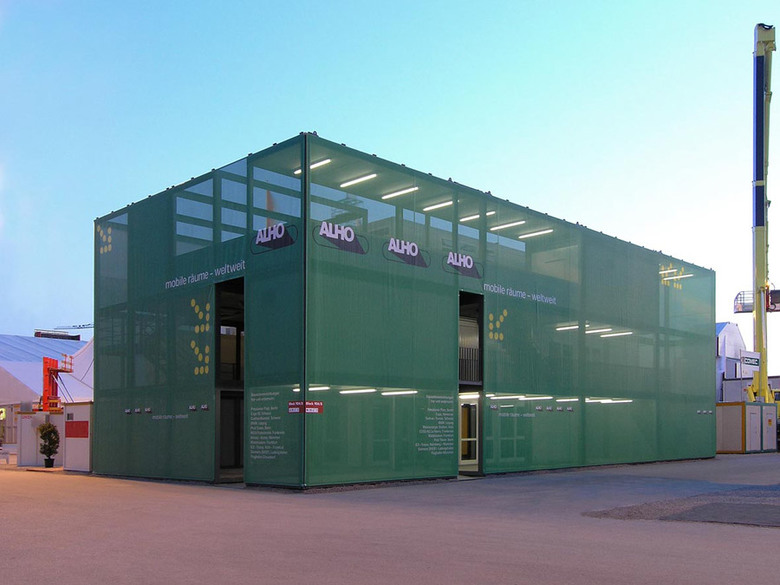 Im Fokus des Messeauftritts der Firma Alho auf der bauma 07 in München, stand der Standardcontainer für die Bauindustrie. 3 x 3 Module, dreigeschossig gestapelt, bildeten das Grundraster des Messestandes. Durch die nichtbelegung des mittleren Feldes formte sich innerhalb des Körpers ein patioartiger Raum aus.