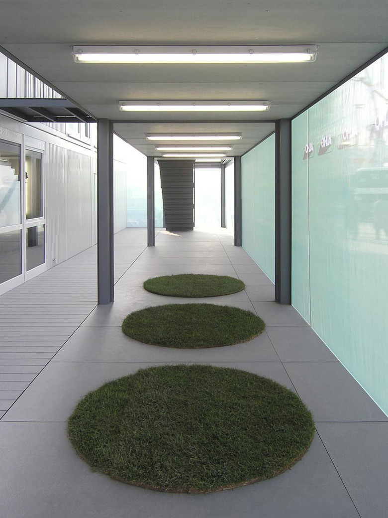 Sichtbezüge zwischen den den einzelnen Funktionsbereichen und Geschossen weckten Neugier und schafften veränderte Perspektiven auf gerade erlebte Räume. Dem Baukörper vorgelagert war ein dreigeschossiger Container-Treppenturm. Verhüllt mit einem Tuch in den Farben der Firma, diente er als weithin sichtbares Werbeelement. Der sich ausbildende Raum empfing den Messebesucher, Bänke luden zum Sitzen ein. Ein in die diagonal gegenüberliegende Ecke eingeschobener grüner Turm wiederholte die werbewirksame Geste.