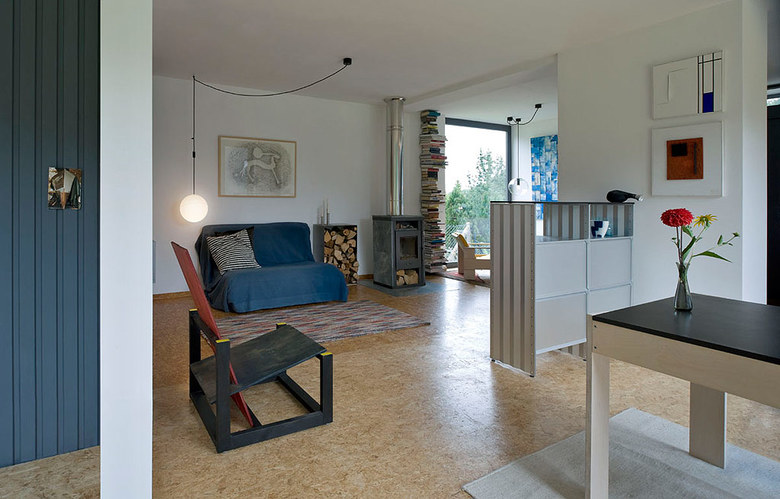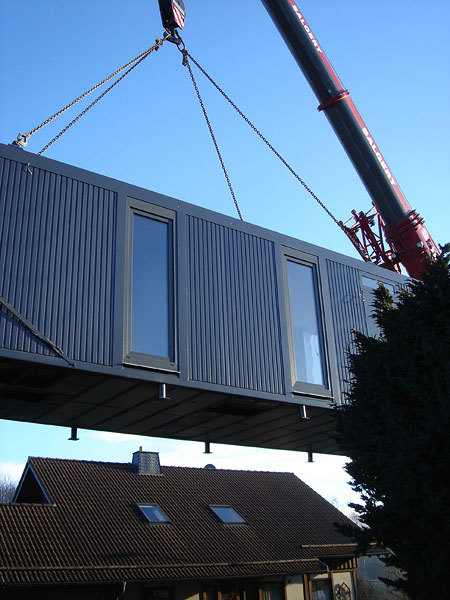 In der idyllischen Ortschaft Kall, auf einem leicht nach Süden geneigten Grundstück, entstand der Wunsch der Bauherren nach einem Haus aus Containern. In einer von Kuhweiden, Wäldern und Satteldächern geprägten Umgebung, faszinierte der Gedanke, ein Gebäude dort nur „ankern“ zu lassen. Ein Vorgängerbüro bearbeitete das Projekt bis zur Genehmigungsplanung bevor wir mit der Aufgabe konfrontiert wurden, diese zu überarbeiten und zu realisieren. Wir optimierten Grundriss und Container-Konstellation, änderten Fassaden und definierten Oberflächen. Nach Detailplanung und vierwöchiger Produktion wurden die „Kisten“ angeliefert und montiert. Lediglich im Bereich des Containerstoßes wurden Decke, Wand und Boden vor Ort angearbeitet, sowie Ver- und Entsorgung angeschlossen. Alles Weitere war schon im Werk vorfabriziert und eingebaut, das Haus somit am selben Tag bezugsfertig. Anfängliche Verwunderung seitens der Nachbarn, über das plötzliche Erscheinen eines neuen Hauses, ist inzwischen positiver Resonanz gewichen. Die überraschende Großzügigkeit im innern des Hauses, wird ebenso bestaunt wie der geschützte Sitzplatz auf der Terrasse hinter dem Haus. Allerdings wird nach wie vor die Frage gestellt, wann die Bauherren wieder Geld zusammenhaben … für das Dach. ; )