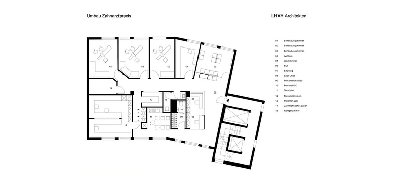 Die 150 qm große bestehende Zahnarztpraxis entsprach sowohl räumlich als auch materialtechnisch nicht mehr den heutigen Anforderungen. Innerhalb von drei Wochen (Praxisurlaub) sollte der Umbau realisiert werden. Auf Grund der zeitlichen Restriktion wurde das Projekt in zwei Schritte unterteilt. Im ersten Schritt wurde der Empfangsbereich, das Wartezimmer, die sanitären Einrichtungen, die Teeküche und der Sterisilationsraum umgebaut. In einem weiteren Schritt werden die Behandlungsräume, das Labor und der Röntgenraum den heutigen Anforderungen angepasst. Die Stahlbeton-Konstruktion des Gebäudes lässt eine hohe Flexibilität der Grundrissgestaltung zu. Diese Freiheit wurde zum Konzept erhoben und alle nicht tragenden Wände abgebrochen. In den Gesprächen mit dem Arzt und dem Praxisteam kristallisierte sich der Wunsch nach einer großen Transparenz bei gleichzeitiger, möglicher Intimität heraus. So wurde ein Kern etabliert, welcher blockhaft in den freien, loftartigen Raum gestellt wurde und von den Verkehrsflächen umspült wird. Dieser Block nimmt die Räume Empfang, Back Office, Personal-Umkleide, Personal-WC, Teeküche, Sterisialtionsraum und Patienten-WC auf. Die Räume Flur, Empfang, Personalbereich fließen ineinander über, es wird keine massive Grenze gesetzt. Das Wartezimmer wurde räumlich an derselben Stelle belassen, wird allerdings nicht mehr durch eine massive Wand geschlossen. Eine raumhohe Glastrennwand mit integriertem Garderobenmöbel lässt eine hohe Transparenz zu und bietet einen Schallschutz. Das Farbkonzept entspricht der reduzierten Formensprache. Der Stahlbeton der Decke wurde wieder hergestellt und zu einem Sichtbeton veredelt. Alle Wände sind glatt gespachtelt und reinweiß gestrichen und bilden somit einen spannenden Kontrast. Der Boden ist ein Vinyl-Belag, in Holzoptik (gekälkte Eiche) gehalten. Dieser fließt in alle Räume und bildet eine "warme" Basis. Sämtliche Möbel sind individuell angefertigt. Die Schränke des Kerns sind mit weissen Schichtstoffplatten und die Möbel des Wartezimmers mit gekälkter Eiche belegt. In den WC-Räumen finden die Patienten in den Wandfliesen das Rot des Praxis-Logos als subtilen "Anker" wieder. Das Lichtkonzept folgt dem Entwurf in konsequenter Weise. So wurde auf jegliche Leuchte in den Verkehrsflächen verzichtet. Der eingestellte Block dient als Lampenschirm und leuchtet die Gänge atmosphärisch aus.