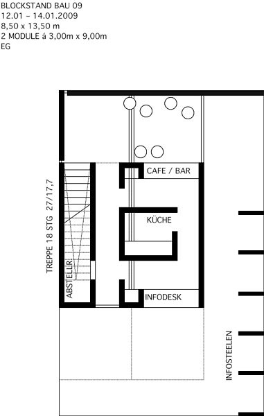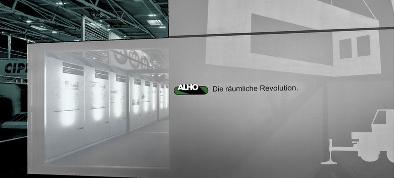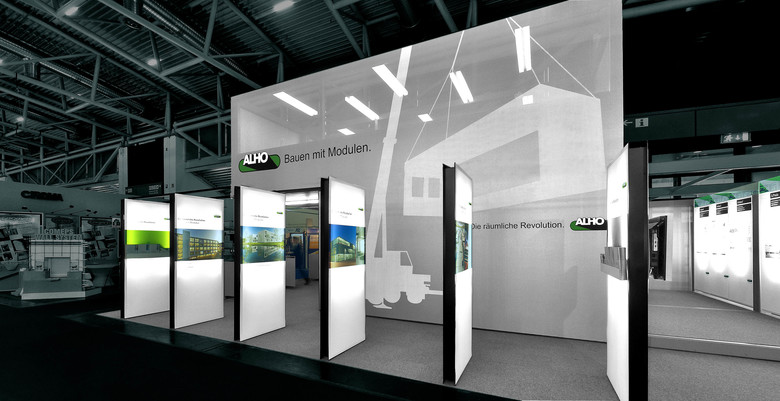 Die Vielfalt des Modulbaus präsentierte ALHO auf der Bau 2009 in München mit Hilfe eines komplexen Baukörpers. Durch das Verschieben des Obergeschosses werden unterschiedlichste räumliche Situationen erlebbar. So beinhalteten die 2 Container im Erdgeschoss den überbauten Empfangsbereich, die allseitig umschlossenen Nebenräume und den offenen Bewirtungsbereich. Eine einläufig gefaltete Stahltreppe führt zu einem großzügigen und offen gestalteten Besprechungsraum im Obergeschoss.