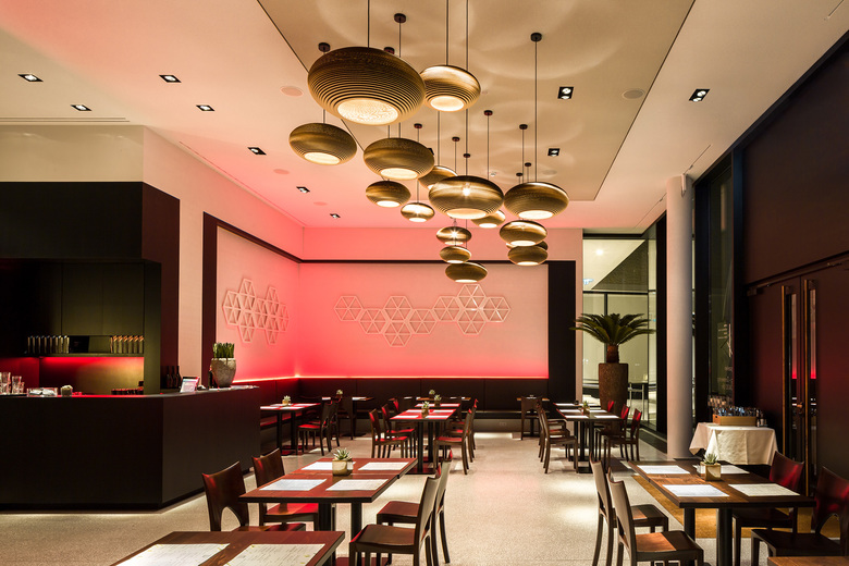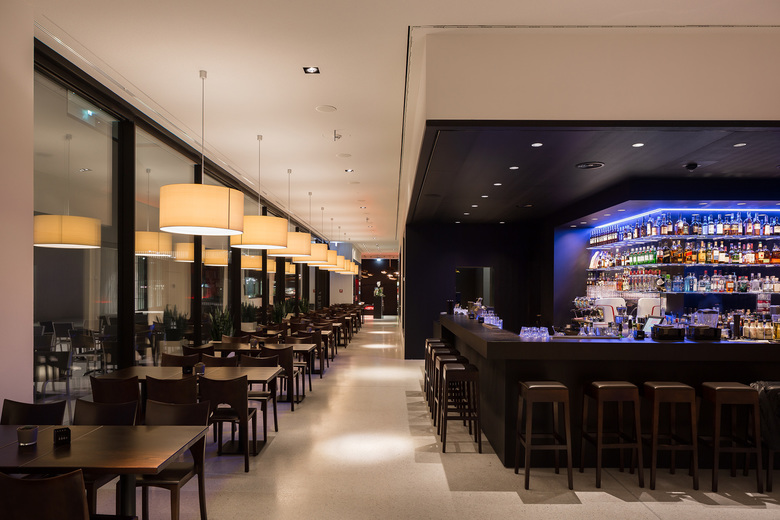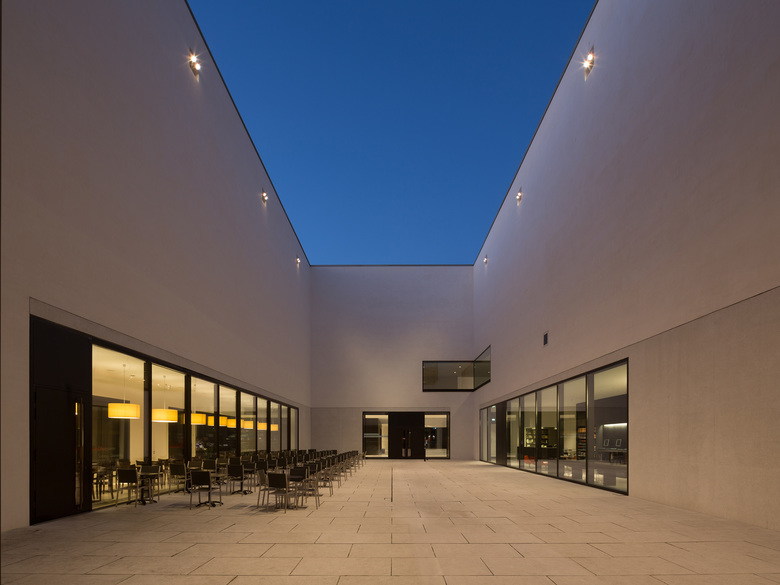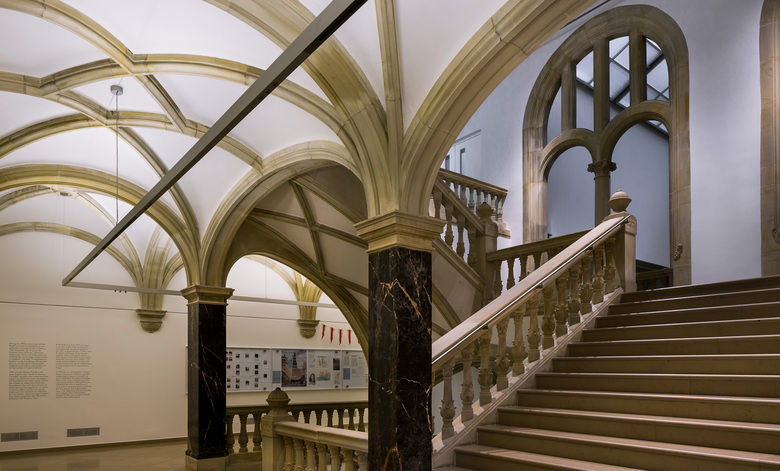 Neben dem Neubau wurden auch die denkmalgeschützten Arkadengänge des Altbaus grundsaniert, welche auf zwei Ebenen ein großzügiges Atrium umlaufen. Als verbindendes Lichtelement fiel die Wahl auf ein umlaufendes, sehr filigranes Leuchtenprofil, welches raummittig auf Höhe der Kapitelle abgependelt wurde, um die Gewölbe indirekt in Licht zu tauchen, als auch kleine Lichtköpfe für die direkte Beleuchtung von Kunst vorzusehen.