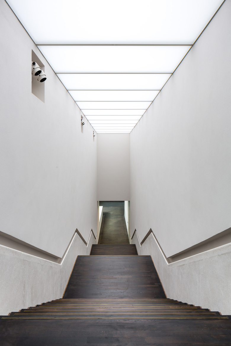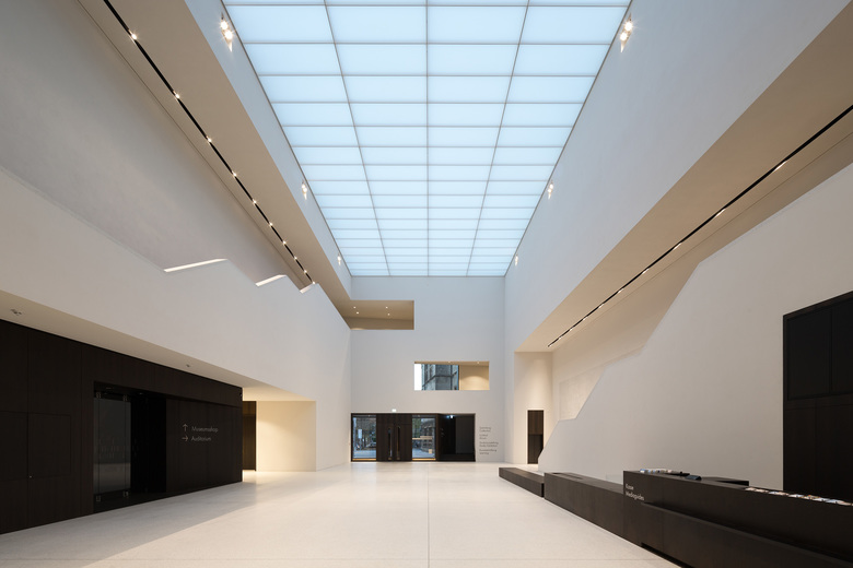 Aber auch der Umgang mit dem Tageslicht und der Blickbezug der Besucher nach außen war speziell in den Ausstellungsräumen mit Oberlichtern und dem Foyer eine besondere Herausforderung. Im obersten Geschoss verfügt das Museum über fünf Oberlichtsäle. Großformatige, mittig angeordnete Tageslichtdecken bringen hier die Dynamik des natürlichen Lichts in den Innenraum. Um für die Kunstwerke gefährliche direkte Sonneneinstrahlung zu vermeiden, wurde ein Glasverbund mit mikroprismatischem Layer im Scheibenzwischenraum verbaut. Er lässt nur diffuses Himmelslicht passieren. Die Lichtmenge kann über ein Rollo reduziert werden. Ein weiteres Rollo steht zur Verfügung, um den Tageslichteintrag komplett zu blockieren. Eine raumseitige, leicht transparente Membrandecke fungiert als zusätzlicher Filter. Um eine identische Kunstlichtstimmung wie in den anderen Ausstellungsbereichen auch in den Oberlichtsälen zu erreichen, kommt hier ebenfalls die Kombination aus umlaufenden Lichtrahmen und Stromschienenstrahlern zum Einsatz.