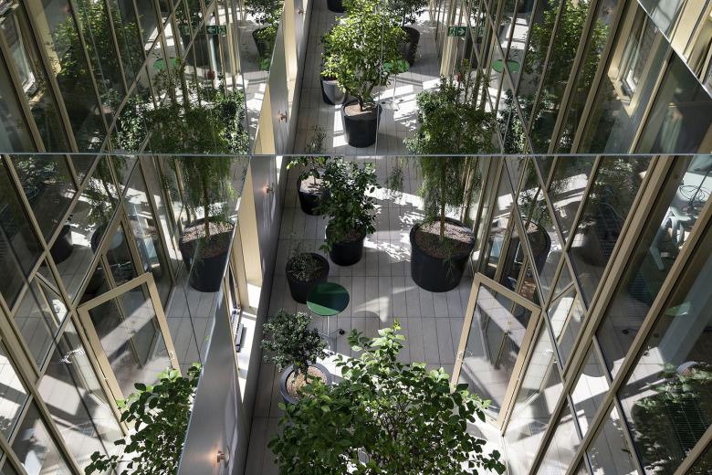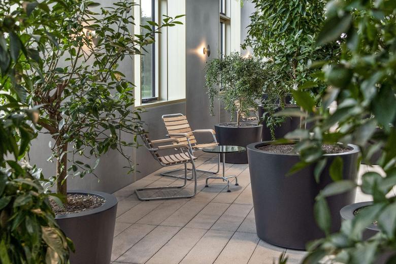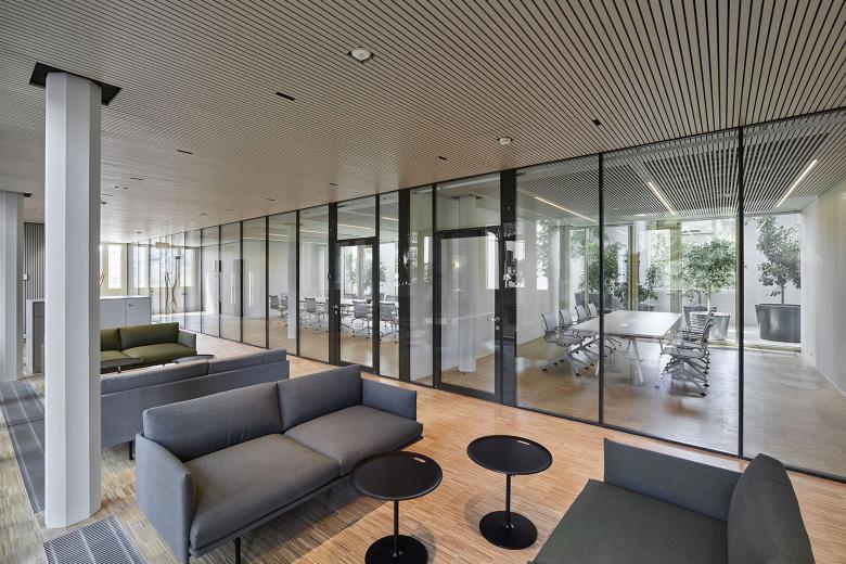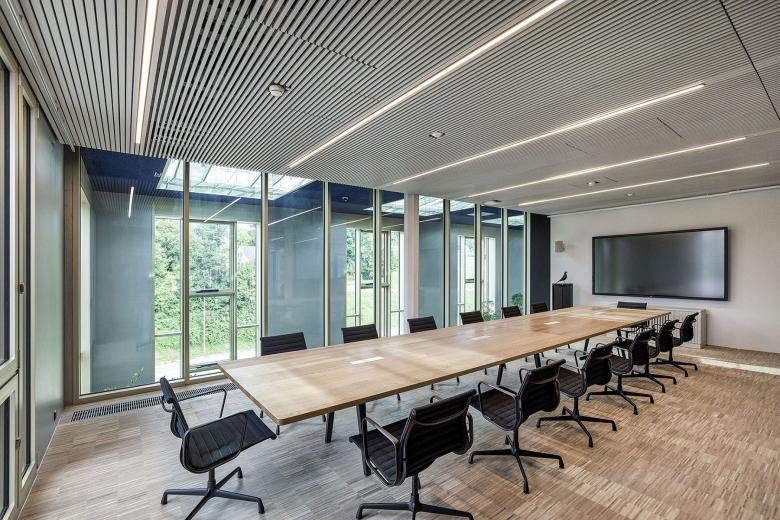 Neben der beratenden Unterstützung für die akustisch wirksame Beleuchtung der Grossraumbüros, wurde lightsphere angefragt, eine Lösung für die Inszenierung der skulpturalen Treppenlandschaft zu entwickeln. Mit der Sanierung des denkmalgeschützten Baus wurde die Treppenskulptur als verbindendes Element in den Bestandsbau integriert. Mit den Auflagen des Denkmalschutzes durfte keine zusätzliche Durchdringung in der Deckenebene für Installationen stattfinden. Aus diesem Grund wurden alle Wände, Verkleidungen und Möblierungselemente, die mit der Sanierung ins Gebäude eingearbeitet wurden, als Lichtträger verwendet. Für die Ausleuchtung der Treppenskulptur sind Wandleuchten zur direkten und indirekten Aufhellung der Erschliessungszone im Einsatz. Diese integrieren sich perfekt in das Plattenraster der Wandverkleidung und unterstützen die Rhythmisierung des Fugenbildes. Da die bestehende Raumhöhe der Zwischengeschossfläche sehr gedrungen ist, wurde mit der indirekten Wandleuchtenposition der Raumeindruck verbessert. Vertikale Lichtbänder, die in die Stirnseiten der Trennwände integriert sind, dienen der Grundausleuchtung der Durchgänge im Zwischengeschoss. Die Treppenskulptur kulminiert in der zweigeschossigen Aufstockung. Dort verbinden die Erschliessungsflächen die Cafeteria sowie die Sitzungszimmer mit den angrenzenden Orangerien. Durch die innenwandig verspiegelten Oberlichter und die zweigeschossigen Fensterflächen werden die Orangerien ideal mit Tageslicht bedient. In den Abendstunden versorgen hochentblendete, tiefstrahlende Einbaudownlights die Orangierien mit Kunstlicht. Die Einbaudownlights sind in der Fassung der Oberlichter integriert. So entsteht eine klare architektonische Formensprache ohne Ablenkung. Als dekoratives Element kommen Wandleuchten zum Tragen, die auf den menschlichen Massstab platziert und materialästhetisch auf die Wandscheiben abgestimmt sind. Dadurch entstehen zwischen den Pflanzen Sitzbereiche, die zum Verweilen einladen.
