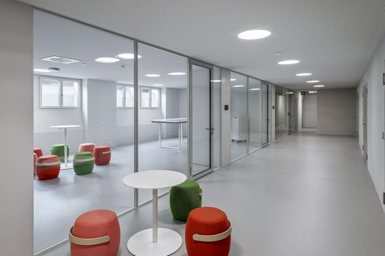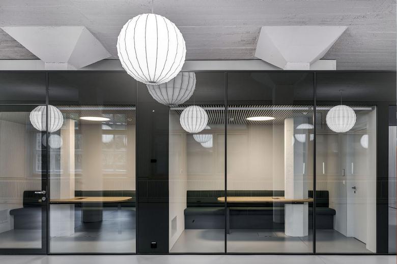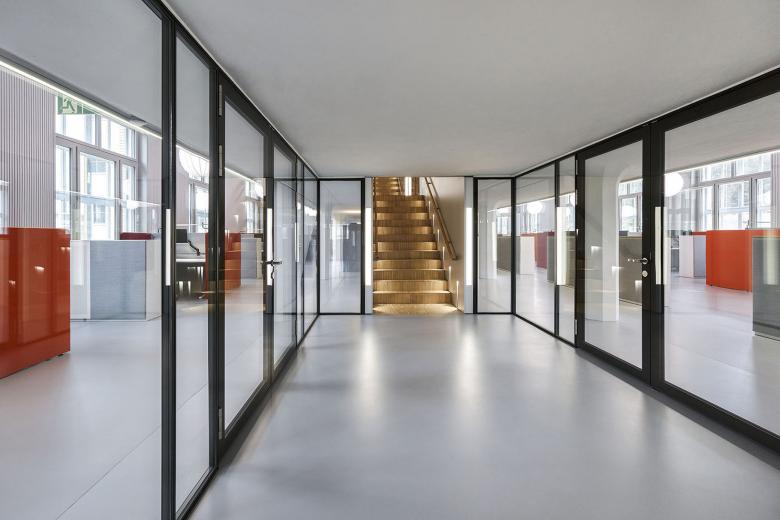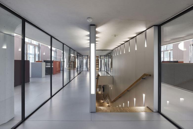 Die Nutzung des Gebäudes und die Materialästhetik werden durch die Auswahl der Lichtfarben gezielt unterstützt. Während in den unteren Ebenen die Grossraumbüros mit den historisch angelehnten Kugelleuchten mit veränderbarem Weisslicht beleuchtet werden, strahlen die aufgestockten Excecutive-Floors in warmweissem Licht. Dies unterstreicht nicht nur die Hochwertigkeit der Holzoberflächen, es verleiht auch ein wohnlicheres Ambiente. Die alles verbindende Treppenskulptur erstrahlt in kühlerem 4000K LED Licht. Mit der Materialisierung von aluminiumbeschichteten Wandvertäfelungen setzt sich dieser Raumbereich klar vom Rest des Gebäudes ab. Dies war eine bewusste Entscheidung, um die unterschiedlichen Gebäudeteile klar zu strukturieren. Besonders schön kommt die Abstufung der Lichtfarben am Abend zur Geltung. Dann können Passanten die Gebäudestruktur nicht nur architektonisch, sondern auch lichttechnisch begreifen.