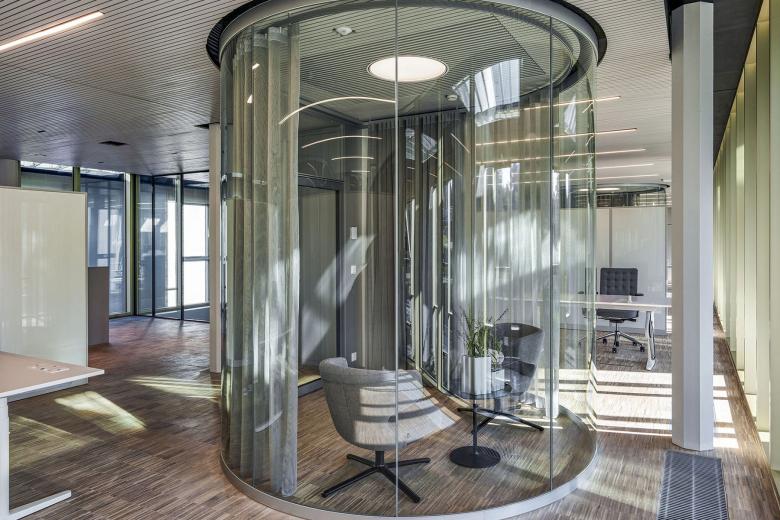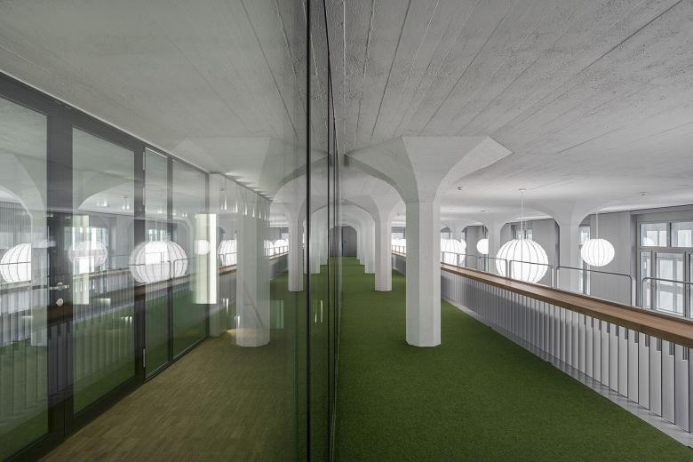 Das bestehende Gebäude 1246 bezieht seine Kraft aus der Klarheit der statischen und räumlichen Struktur im Innern und der markanten Präsenz einer industriellen Backsteinarchitektur aus den 30er-Jahren von aussen. Drei überhohe Geschosse mit teilweise bestehenden Galerien werden zu klar strukturierten Clusterbüros umgenutzt. Eine zweigeschossige Aufstockung beherbergt die Cafeteria und zwei Orangerien als soziale Treffpunkte und als Executive-Floor. Für das Projekt wird ein eigenes Bürokonzept und eine akustisch aktive Beleuchtung unter Berücksichtigung der Aspekte des „human office“ entwickelt. So entsteht ein wohnliches und grosszügiges Arbeitsumfeld mit differenzierten Angeboten. Verbunden werden die Geschosse durch eine skulpturale Treppe als Ort des Austausches und der Kommunikation.