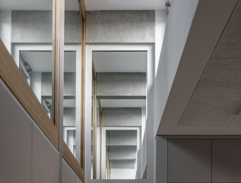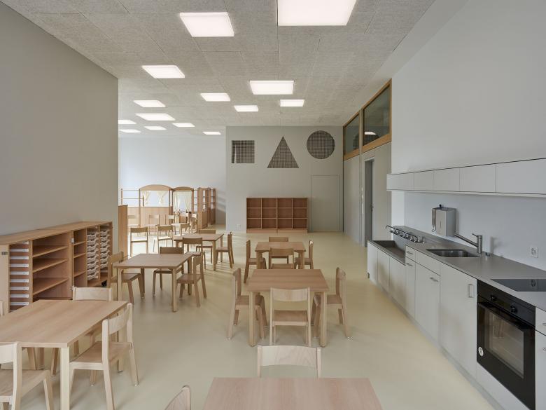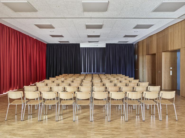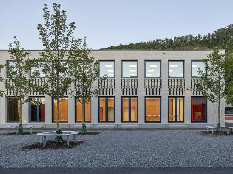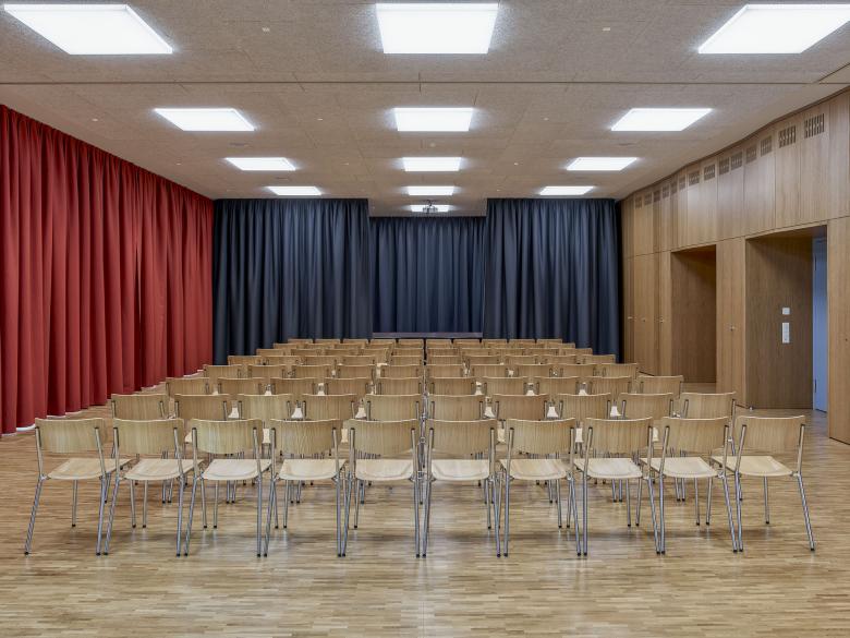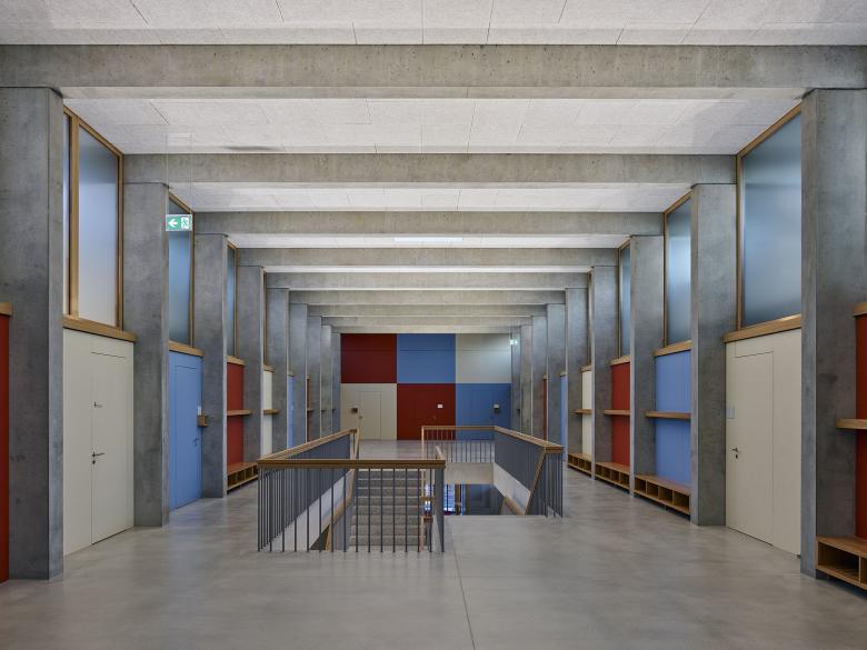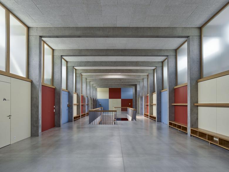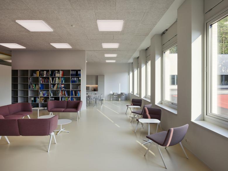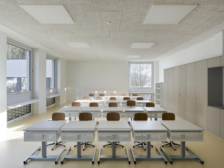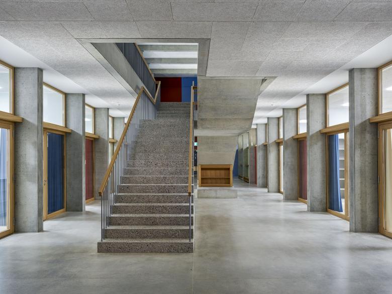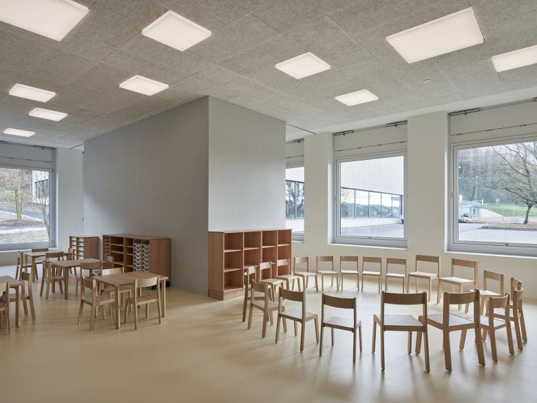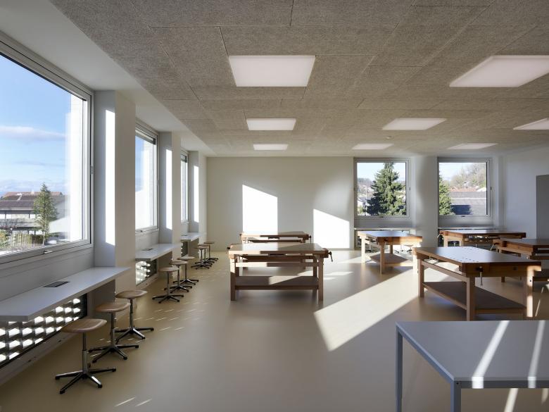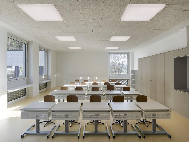 Alle Unterrichtsräume einschliesslich der zentralen Haupthalle sind dank einer ausgeklügelten Tageslichtplanung optimal mit Tageslicht versorgt. Die ergänzende künstliche Beleuchtung integriert sich zurückhaltend und teilweise unsichtbar in den architektonischen Kontext.