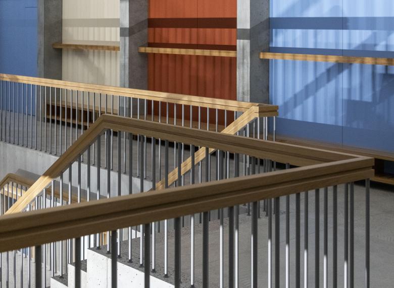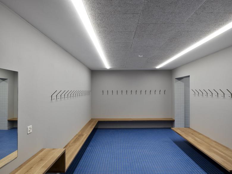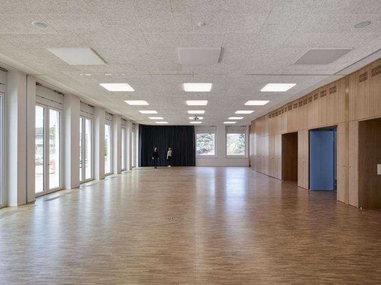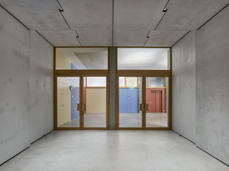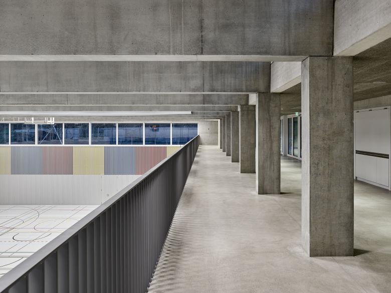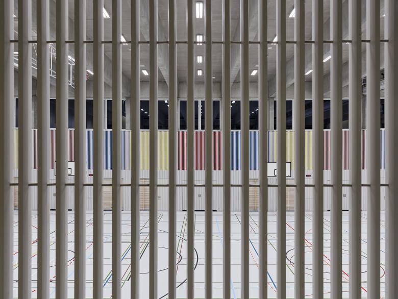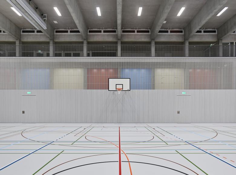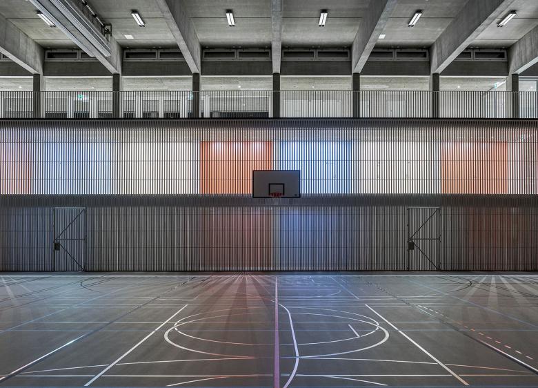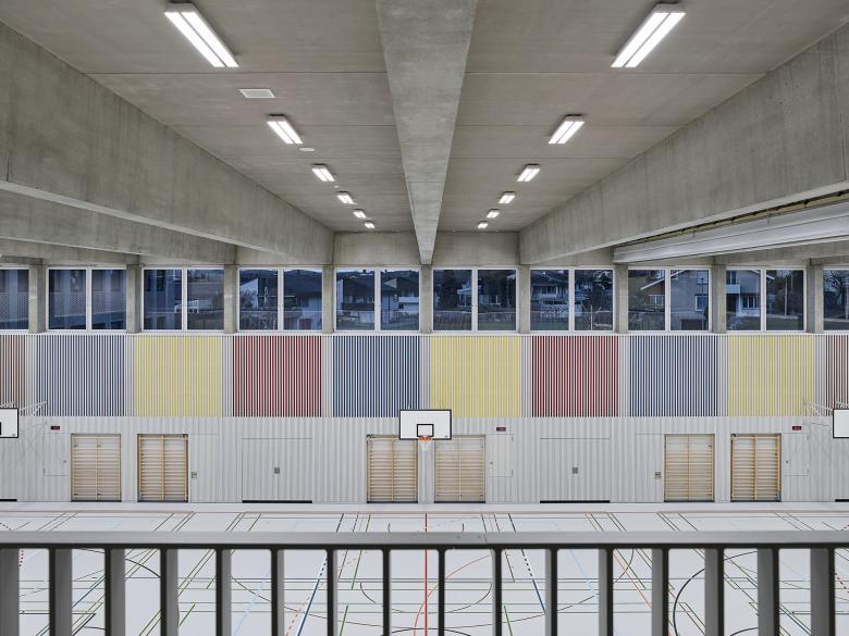 Die Beleuchtung der Turnhalle steht ganz im Zeichen der funktionalen und vertikalen Beleuchtung. Dank dem Fokus der vertikalen Beleuchtung entstehen spannende Blickwinkel und Raumbezüge sowie ein Spiel von Licht, Farbe und Reflexion.