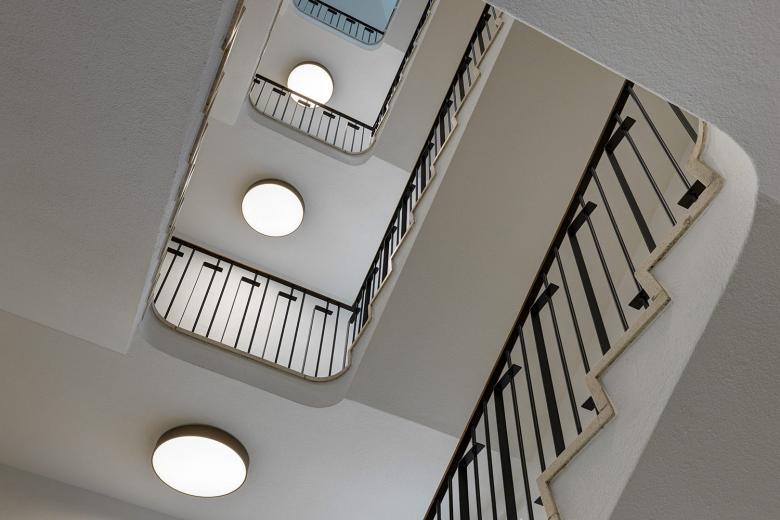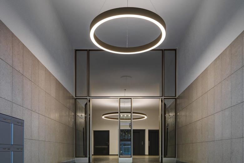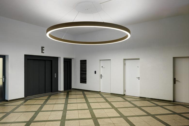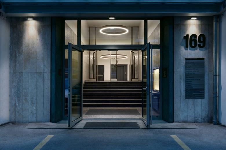 Mit dem Umbau und der Sanierung der Erschliessungskerne im Gebäudekomplex Hardturmstrasse 169-175 entstand eine repräsentative Aufwertung des historischen Gebäudes. Die sorgfälltig ausgewählten Materialien wurden von Marazzi + Paul Architekten raffiniert bis ins letzte Detail umgesetzt. Zur Unterstützung der Hierarchiestufen innerhalb der Treppenkerne dient die Formen- und Materialsprache der Beleuchtung. Die Abstufung von eloxierten Ringleuchten in den Empfangshallen bis hin zu technisch anmutenden Glasleuchten in den Nebenkorridoren strukturieren die Raumabfolge entsprechend der Nutzung. Aufgrund der Vorgaben der Denkmalpflege, die bestehende Bausubstanz nicht zu beschädigen, wurden alle notwendigen zusätzlichen Sensorikelemente in den Leuchten und Leuchtenbaldachinen integriert.