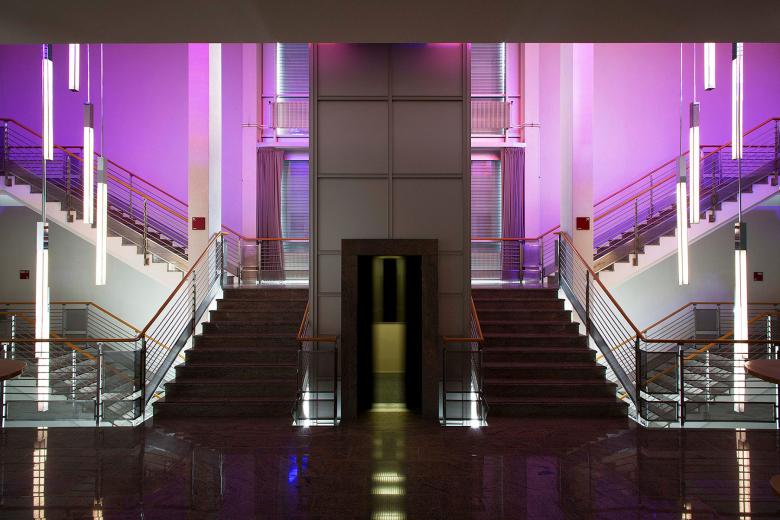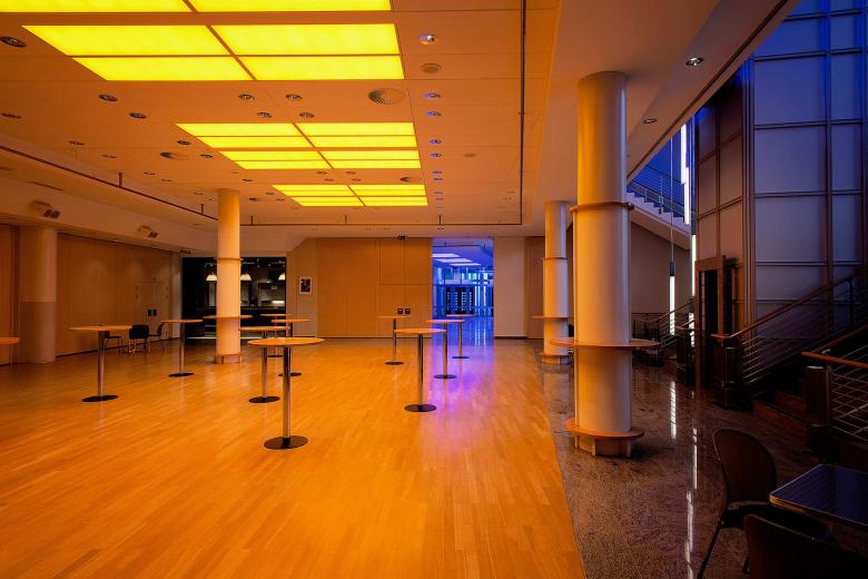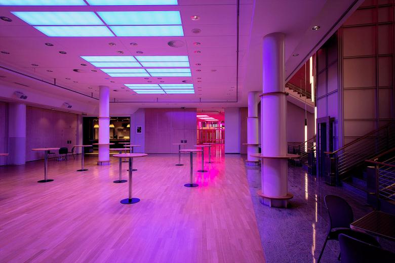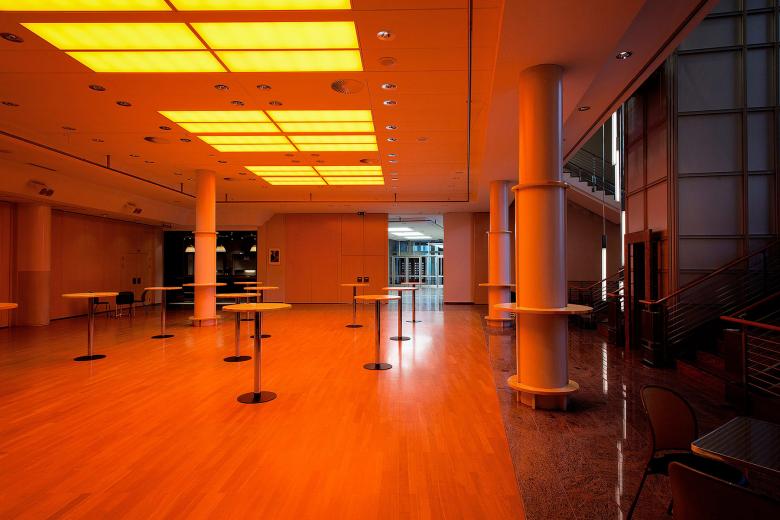 Mitten im Zentrum von Vaduz gelegen bietet der Vaduzersaal ideale Voraussetzungen für Grossveranstaltungen, Seminare, Ausstellungen und Konferenzen. Da die ursprüngliche Beleuchtungsanlage den wachsenden Anforderungen und vor allem dem Energieeffizienzstandard der Gemeinde nicht mehr entsprechen konnte, wurde der gesamte öffentliche Bereich der Beleuchtung saniert. Hoch entblendete LED Einbaudownlights erzeugen zusammen mit den projektspezifischen Leuchtenfeldern und einer intelligenten Steuerung eine neue Art der Flexibilität bei einer Energieeinsparung von über 80%. Teile der Akustik- und Kühldecke wurden mit Lichtfeldern ersetzt, die neben dynamischen Weisslicht auch mit RGB-LED-Platinen bestückt sind. Vordefinierte Lichtszenen und die einfache Farbauswahl über die zentralen Bedienstellen im Gebäude ermöglichen die passende Lichtstimmung für jeden Anlass.