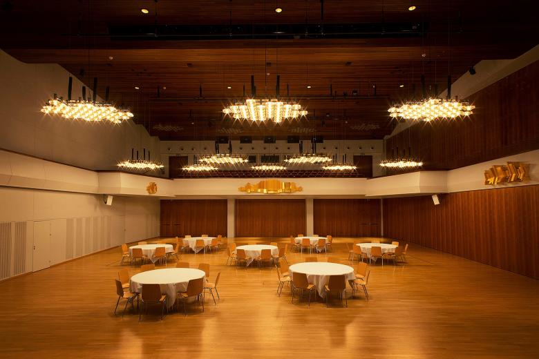 Das Herzstück des Vaduzersaals sind die bestehenden Kronleuchter im Hauptsaal. Der Ersatz der diffusen Glühlampen mit LED-Filament Lampen konnte die Qualität der Gussglasstruktur aufwerten. Zusätzlich installierte Leuchtenlifte ermöglichen es nun, die Kronleuchter auf einen menschlichen Masstab abzusenken, was besonders für festliche Anlässe geschätzt wird.