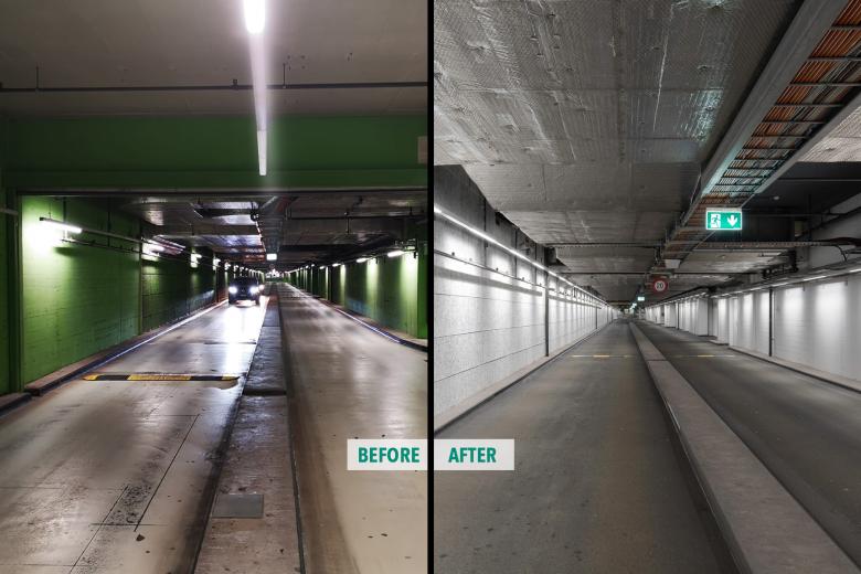 Nachhaltigkeit war ein wichtiger Aspekt des Projekts. Die gesamte Einstellhalle wurde nach dem Minergie-Standard geplant und zusätzlich mit intelligenter Sensorik ausgestattet, um den Energieverbrauch während der Öffnungszeiten zu optimieren. Im Vorher-Nachher-Vergleich ist deutlich erkennbar, welchen Mehrwert eine gezielte und auf die Nutzung abgestimmte Beleuchtungsanlage bewirken kann.