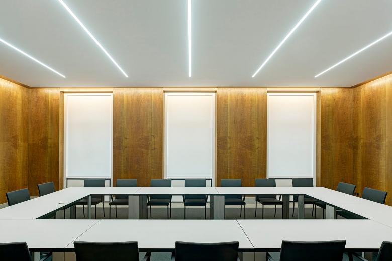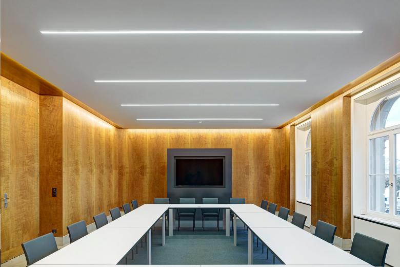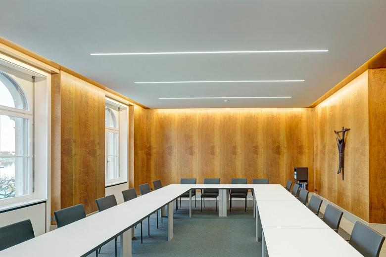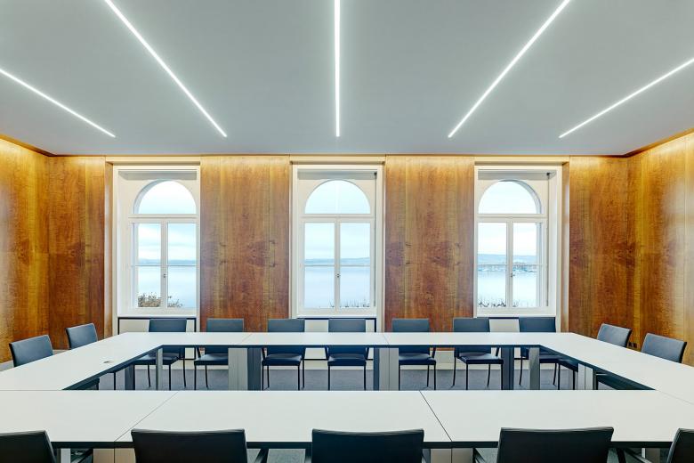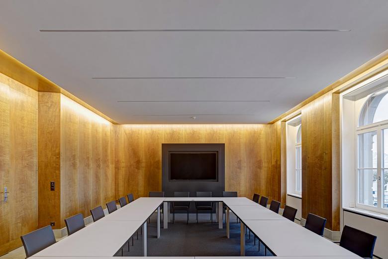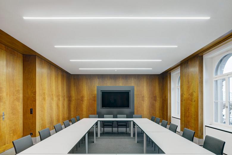 Die neue Gestaltung des Kommissionszimmers im Regierungsgebäude des Kantons Zug ist konsequent sachlich und schlicht gehalten. Die völlig neu überdachte Beleuchtung und Möblierung führen einen respektvollen Dialog mit dem ursprünglichen Gebäude.