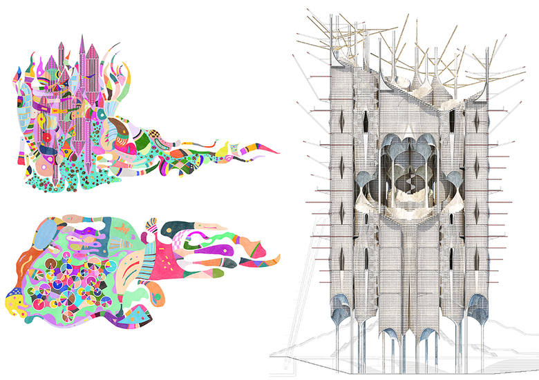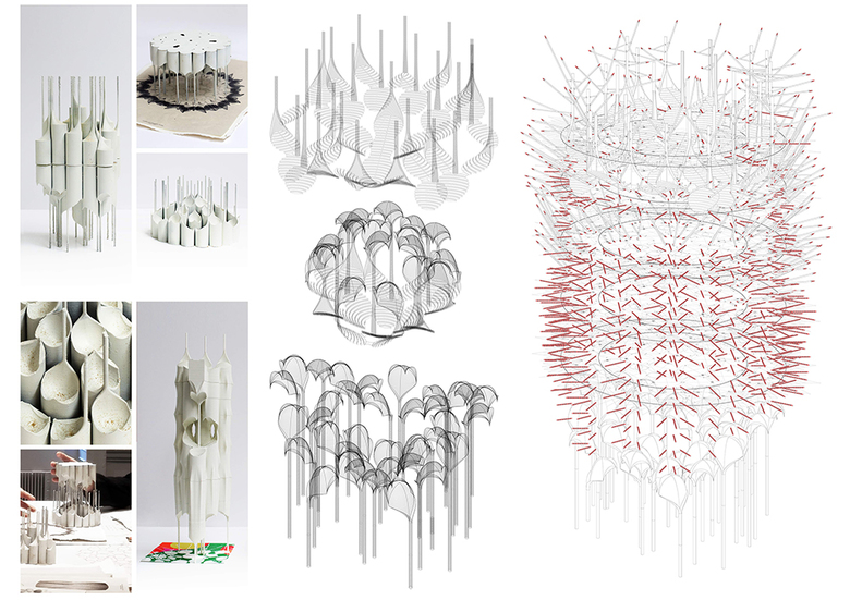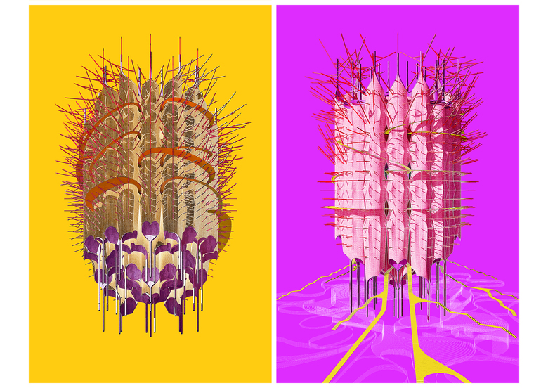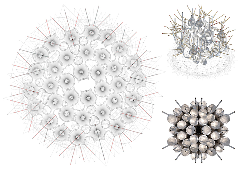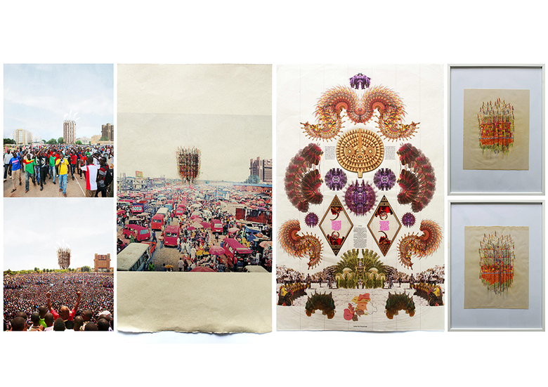 The compound is protected within an inhabitable cladding shaped by rings of cantilevered wooden sticks, hint to the animalistic costumes used by the people in certain African religious rituals. The sticks stabilize the lateral forces in the silos, producing a fragile mass and – through the possibility of hanging different pieces and fabrics – a direct public involvement between people and architecture.