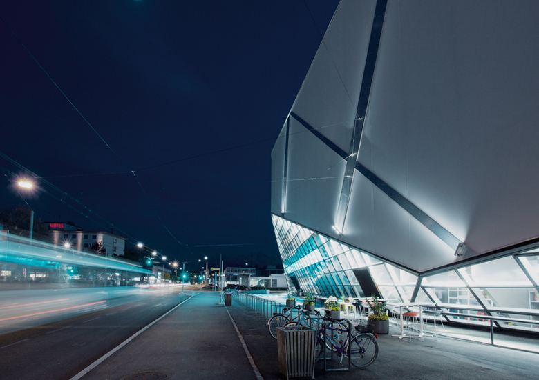 Die Rücksprünge, Neigungen und dem Höhenverläufe des Gebäudes ergaben sich aus der fast übersteigerten Umsetzung der stadtplanerischen Vorgaben. In diese Outline aus Regeln wurde das Volumen gegossen. An seiner Unterseite, an der Alpenstraße entlang einer wellenförmigen Linie ist das Volumen aufgeschnitten. Dieser Schnitt folgt der formalen Logik des Volumens und unterstreicht die Dynamik des Baukörpers entlang Straße. Die so entstehenden Einschnitte bilden die Eingänge bzw. Zufahrten. Eine Membranfassade gibt eine homogene Oberfläche. Die glänzenden Bänder heben die Dynamik noch weiter hervor. Es entsteht ein dynamischer, perspektivischer, dramatischer Baukörper.