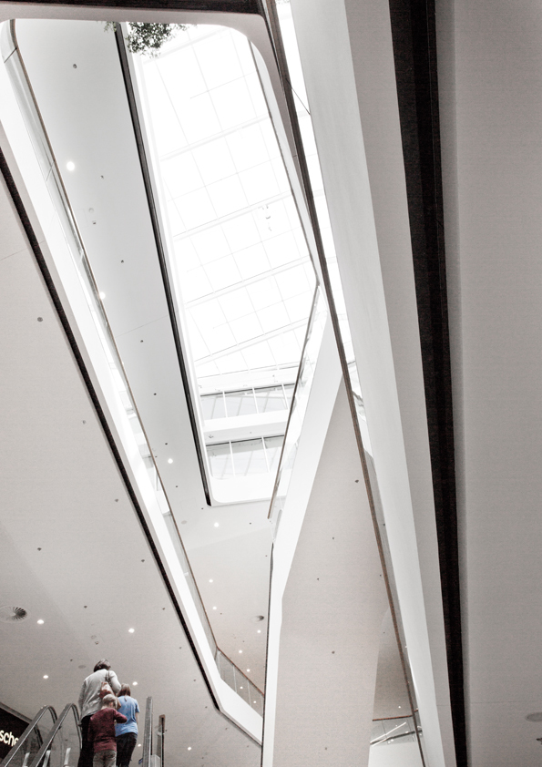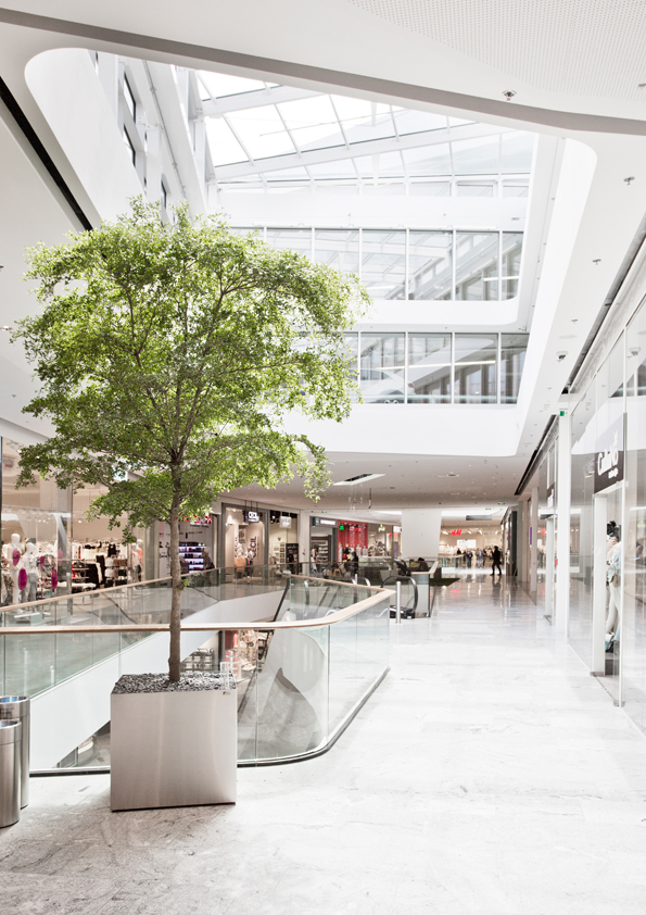 Vom ersten Untergeschoß aufwärts öffnen sich Atrien – somit wird die Mall in allen Geschossen mit natürlichem Licht durchflutet und visuell sowie funktional mit den Park-Ebenen verbunden.