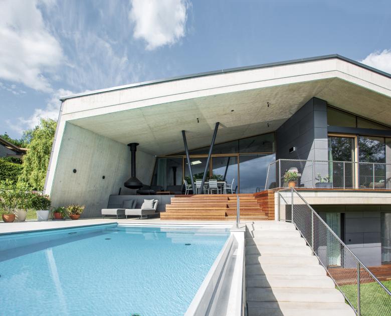 Ein relativ steiles Hanggrundstück mit herrlichem Ausblick über Graz und der Wunsch nach Verbindung von Haus und Garten waren die Vorgaben des Entwurfes der Villa P. Die Grundidee war dem Hang mit einer Abfolge von Ebenen in seiner Topografie zu folgen, auf welchen sich die Villa mit ihren Räumen, Zonen, Außenbereichen und auch Terrassen und Pool entfalten kann. Der Eingang und die Zufahrt erfolgen über den Vorbereich und der Carport am oberen, schmalen Ende des Grundstückes. Die oberste Ebene, ganz auf die fantastische Aussicht gerichtet, beherbergt die Wohnräume, Wohnküche und den Elternbereich mit Elternschlafzimmer und Bad.