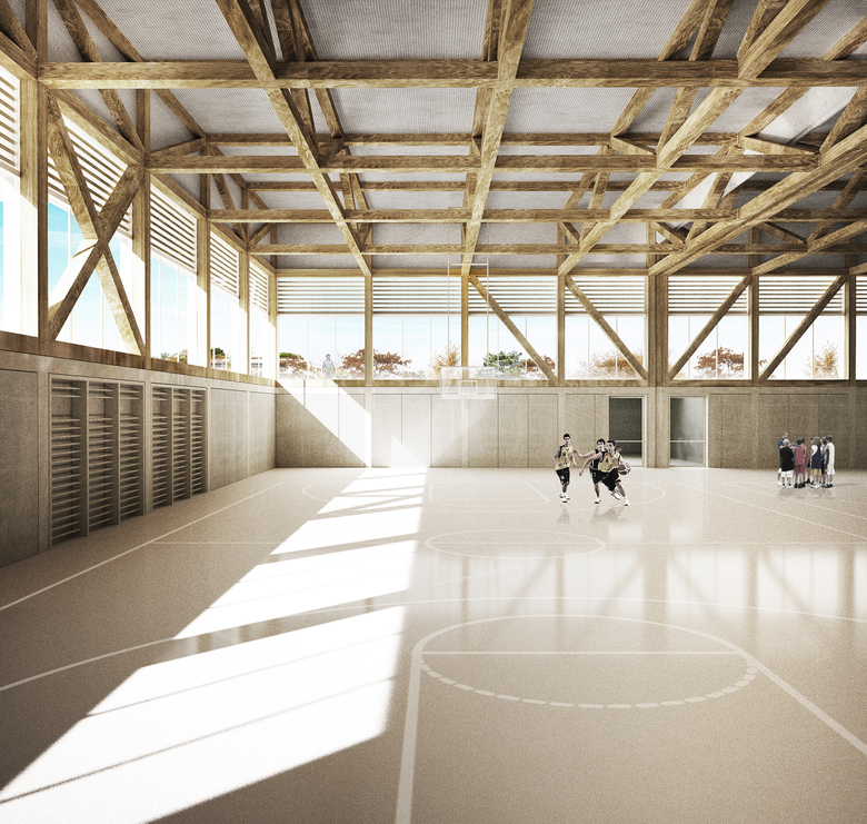 Die zwei neuen Baukörper führen die bestehende Anlage weiter und schaffen einen zentralen Ort des Austausches. Sie werden bewusst als Weiterführung der aus mehreren Gebäudefragmenten bestehenden Anlage verstanden. Das erste Volumen beinhaltet die Aula und sämtliche Schulräume, das zweite Volumen die Turnhallen mit darunterliegender Einstellhalle.