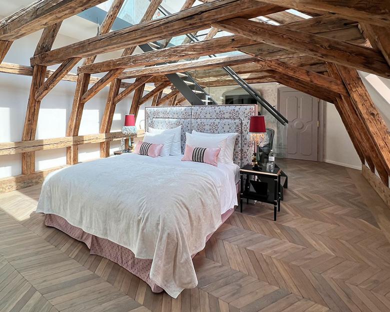 Mindestens genauso bewegt war die fast 9-jährige Planungs- und Bauzeit, die von allen Beteiligten ein hohes Maß an Einsatz verlangte. In Zusammenarbeit mit Denkmalschutzexperten und Archäologen schafften wir einen respektvollen Umgang mit diesem gewachsenen Stadtjuwel und konnten sogar den bereits zum Abbruch freigegebenen historischen Dachstuhl erhalten und in das Hotelkonzept integrieren. So haben die 76 Zimmer je nach Lage, ob unterm Dach oder in der „Belétage“, jeweils einen ganz individuellen Charakter. Der Innenhof als Herzstück des Gebäudes ist gastronomisch belebt und kann mit einem textilen Witterungsschutz überspannt werden. Geschäfte und Gewerbetreibende haben eine ansprechende Auslage im Erdgeschoß inmitten des 1. Bezirks.