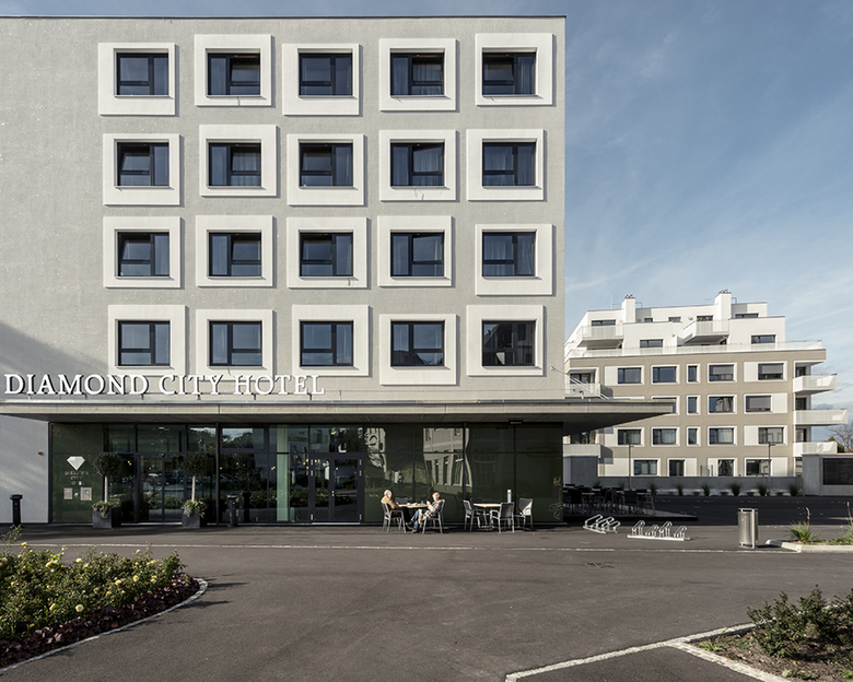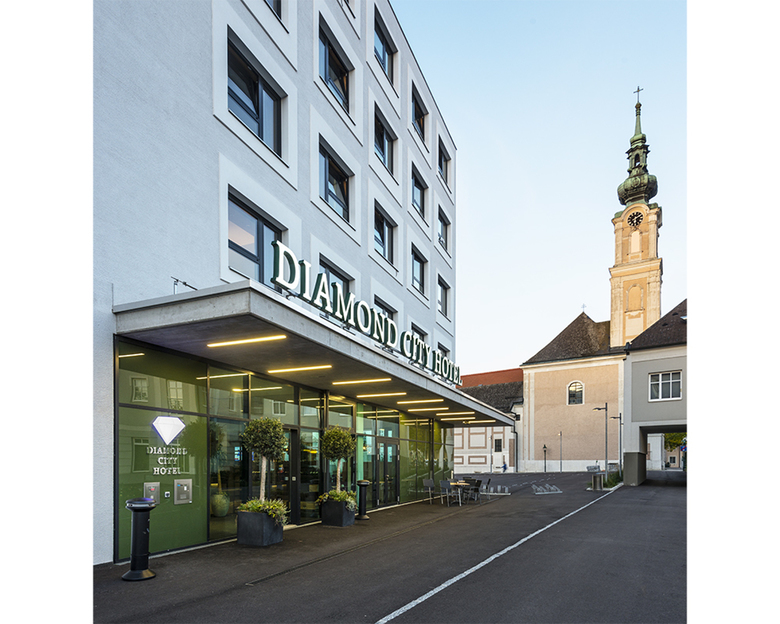 In der historischen Altstadt von Tulln, direkt an der Donau, ließen wir uns von den Aus- und Durchblicken Richtung Stadt und Donau inspirieren. Mit einer Grundstücksteilung wurde neben dem Hotel Platz für zwei Wohngebäude geschaffen. Das neue Hotel wurde von der Minoritenkirche abgerückt und bildet mit ihr zusammen einen städtischen Platz. Das Hotel ist für Messebesucher, Seminarteilnehmer und Donau-Radfahrtouristen ausgelegt. Bei der Fassadengestaltung haben wir die traditionellen Fensterfaschen der Tullner Altstadthäuser aufgegriffen und diese neu interpretiert. Die Putzfassade ist in rauhem Besenstrich ausgeführt und glitzert in der Sonne, passend zum Namen des Diamond City Hotels.