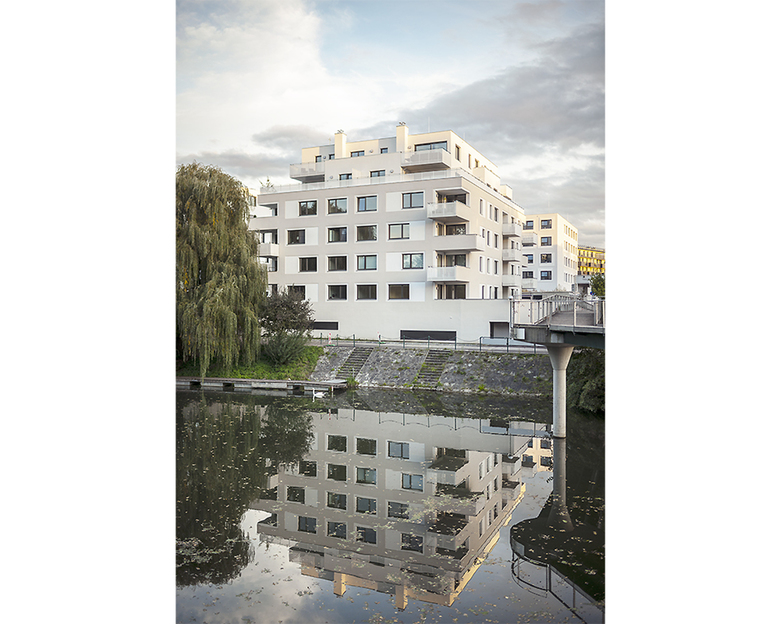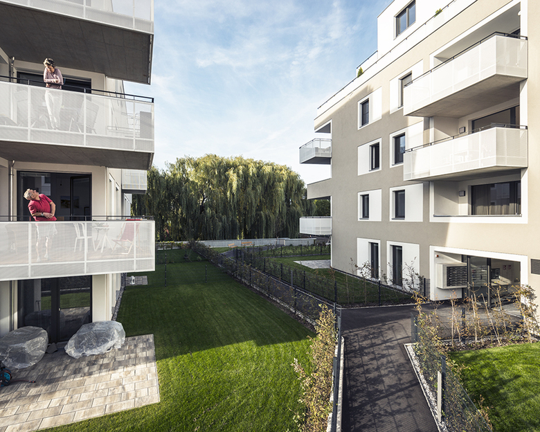 Die Wohnungen haben aufgrund der günstigen Grundstückslage Freiräume mit Blick auf die Donau und die Altstadt. Die Balkone an den Ecken lockern die kompakte Erscheinung der Gebäude auf. Das Gelände fällt zu den Donauauen hin ab, so dass unter den Wohngebäuden entlang der Donaulände eine natürlich durchlüftete Tiefgarage eingeschoben werden konnte. Die Tiefgarage ist ökonomisch erschlossen: sie hat eine gemeinsame Einfahrt mit der Tiefgarage des Hotels. Die Anlage wird über regenerative Energien betrieben. Auf den Dächern sitzt eine Photovoltaik-Anlage und das am Bauplatz nahe Grundwasser wird über Grundwasserbrunnen und Wärmepumpe für die Kühlung des Hotels und der Wohnungen genutzt.