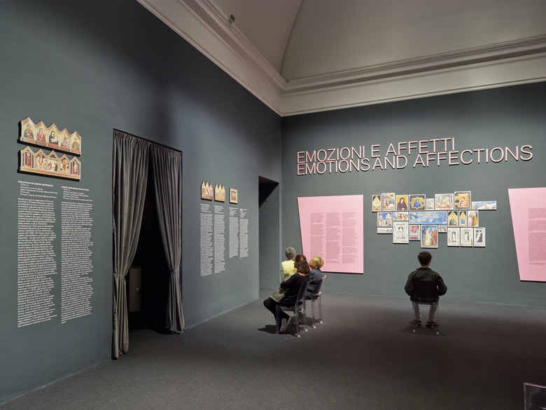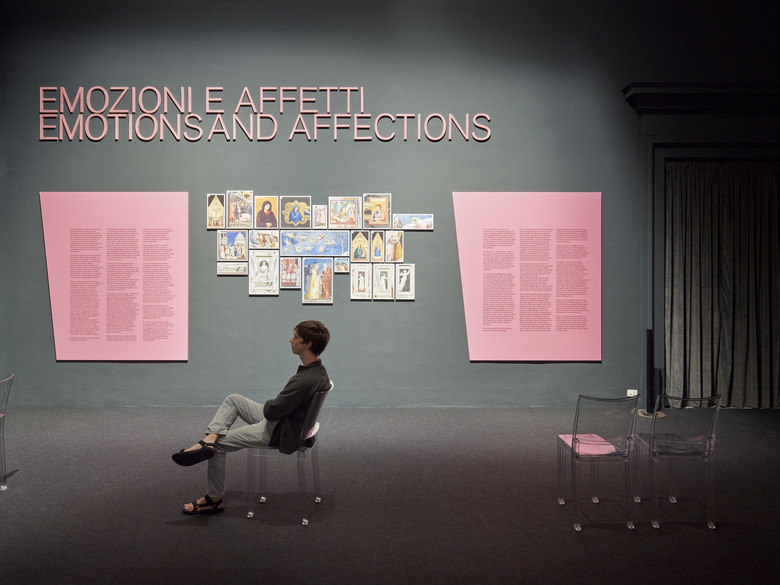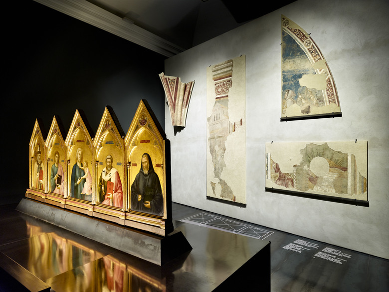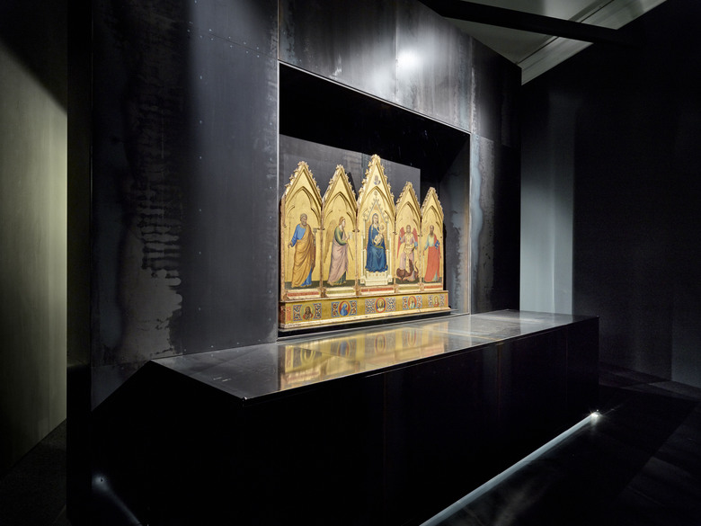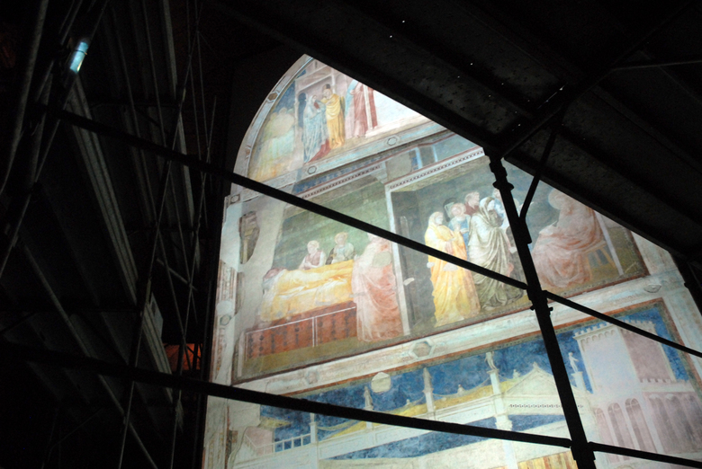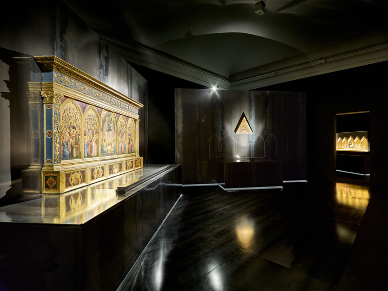 Set. Not a true theatre, the Palazzo Reale is transformed into a total theatre, a place of meeting and exchange for the audience (us) and the characters (Giotto’s works) with the force of two powerful stage machines: light, in all of its manifestations including also half-light, shadow, darkness and the control of the reflections and of colour.