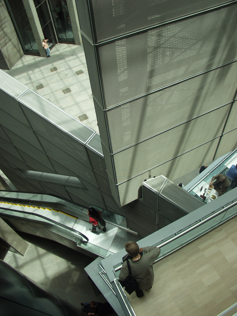 A network of angled winds, in very light hi-tech materials, partially invades the hall: it is a sort of “genie in the lamp” that distributes visitors to the various floors, and features a caféobservatory on the mezzanine floor.