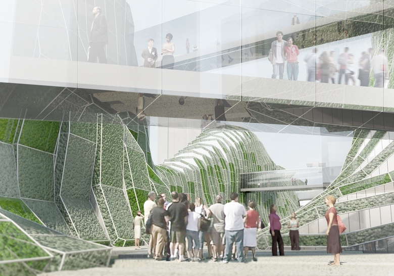 A “green mantle” covers all the buildings of the project, linking them to the existent environmental system in the context by attempting at the same time to build a recognizable place on the urban scale.