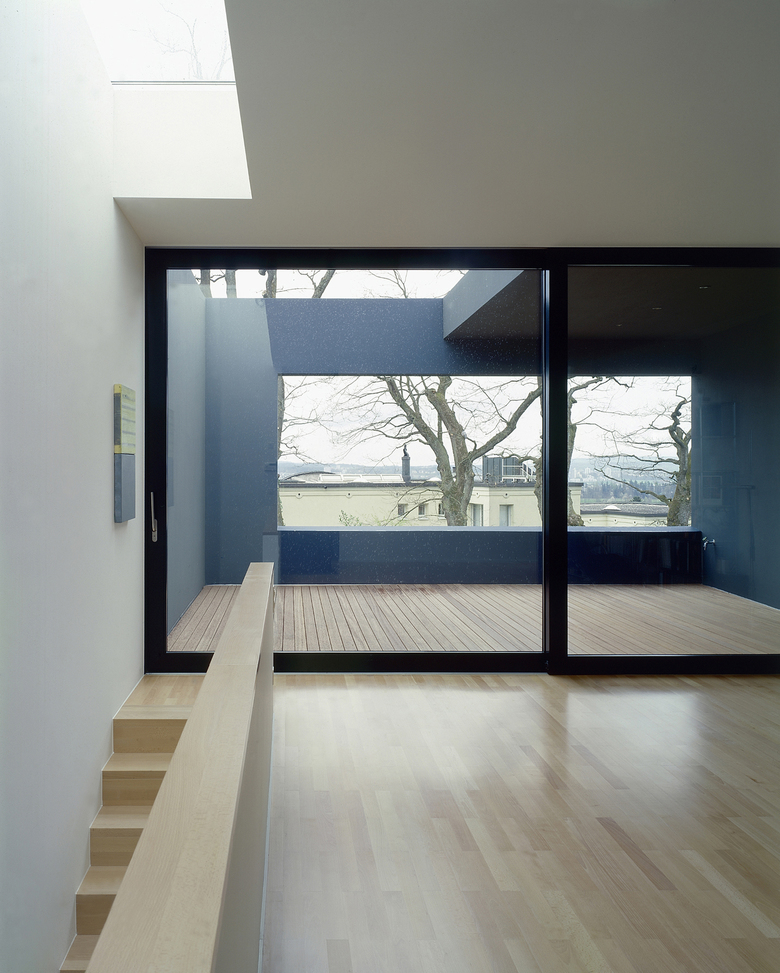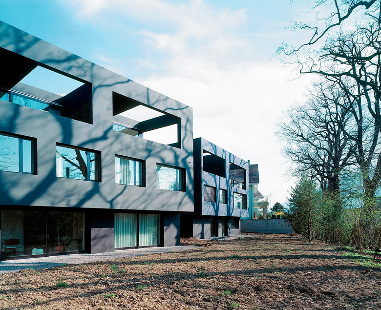 Der Zuschnitt des Grundstücks sowie die zweckorientierte Optimierung der Wohn-Nutzflächen führte zu zwei trapezförmigen Baukörpern. Die Volumen wurden parallel versetzt, sodass sie im Osten einen Zugangshof, im Nordwesten einen Gartenhof definieren. Durch die Kombination von dunkelgrün und dunkelblau gehaltenen Fassaden sind diese Aussenräume farblich spezifiziert. Die Brückenelemente der Eingänge überzeichnen die topografischen Verhältnisse und erhöhen die Privatheit der Einheiten. Auch die ausgeschnittenen hofartigen Öffnungen im Dachbereich gewähren als geschützte Loggien trotz hoher Dichte Privatheit. Die Variation der Grundrisse hatte Einfluss auf die Anordnung und Grösse bestimmter Fenster, und damit auf die Fassadengestaltung. Formal bezeichnend sind reduzierte Details für Dachränder und Fensterbänke. Unterschiedlich tief eingesetzte Fensterflächen entsprechen der räumlichen Situation im Innern sowie der Notwendigkeit, je nach Fall, von Storen-Stürzen. Diese charakterisieren den Ausdruck der Gebäude und relativieren die Kargheit der äusseren Erscheinung.
