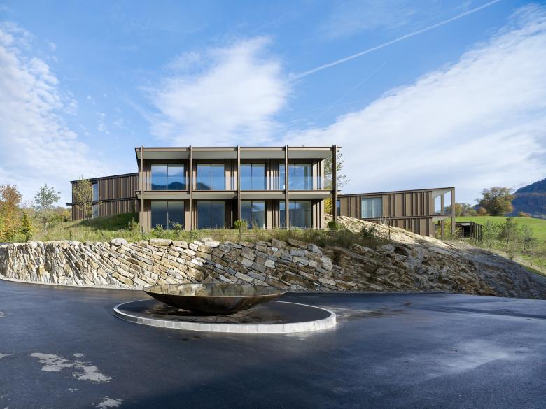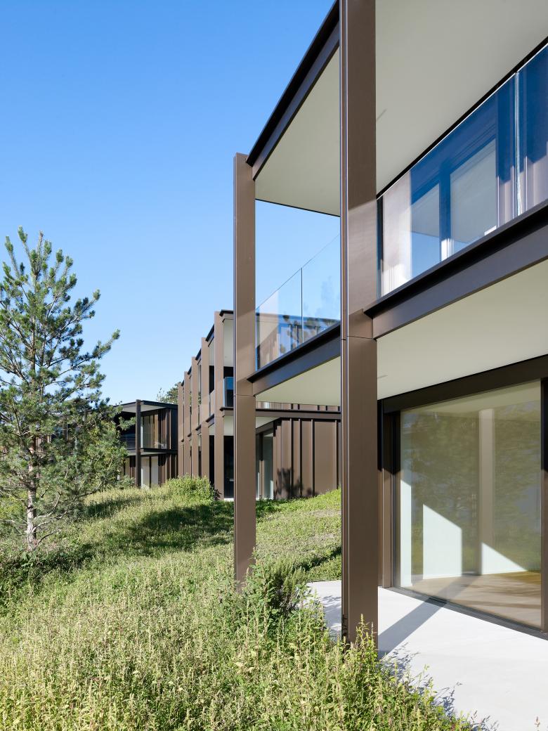 Die Qualität des Bauperimeters ist durch seine exponierte Lage auf der Halbinsel Hertenstein geprägt, umgeben vom Vierwaldstättersee mit Sichtbezügen zu Bürgenstock, Rigi und Pilatus. Das Projekt auf der Hügelkuppe gestaltet sich als gesamtheitliche, parkähnliche Anlage mit grossen Freiräumen, Wald- und Uferzonen, Wander- und Flanierwegen und einer üppigen Pflanzenwelt ein. Die Setzung der Wohngebäude folgt dem Duktus der natürlichen Topographie und deren Massstab und orientiert sich an den umgebenden bestehenden Wohngebäuden. Den neuen Gebäuden sind Terrassen- und Gartenflächen vorgelagert, welche der offenen Parklandschaft genügend Raum lassen. Die Lage der Gebäude am Rande des Höhenplateaus verleiht ihnen aufgrund der Topografie eine natürliche Aussichtslage. Die Anordnung der neuen Bauten hinsichtlich ihrer Höhenlage sind so gestaffelt, dass die südlichen tiefer am Hang liegen und somit die „hinteren“, nord-westlichen Gebäude in Ihrer Orientierung zur Aussicht nicht wesentlich gestört werden. Die Bebauungsstruktur unterscheidet zwei Gebäudetypologien: Das Doppelfamilienhaus und das Mehrfamilienhaus. Sie bieten total 38 Wohnungen. Jedes der freistehenden Gebäude bietet Fernsicht und ist hinsichtlich Aussicht und Belichtung optimal ausgerichtet. Die Architektur und die Materialisierung beziehen sich referenziell auf die örtlichen Bebauungsstrukturen. Die mit unterschiedlichen Dimensionen vorgesehenen Gebäude sowie deren vorgelagerte Balkonschicht ergeben eine stimmige Massstäblichkeit.