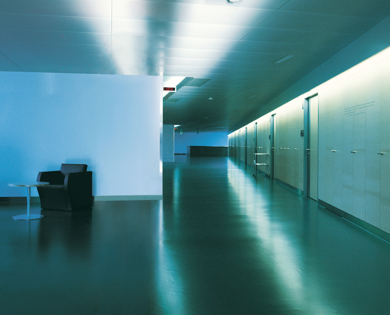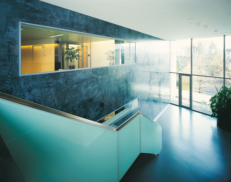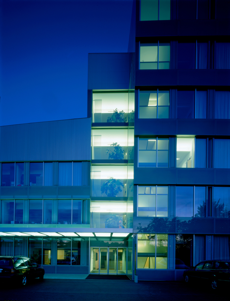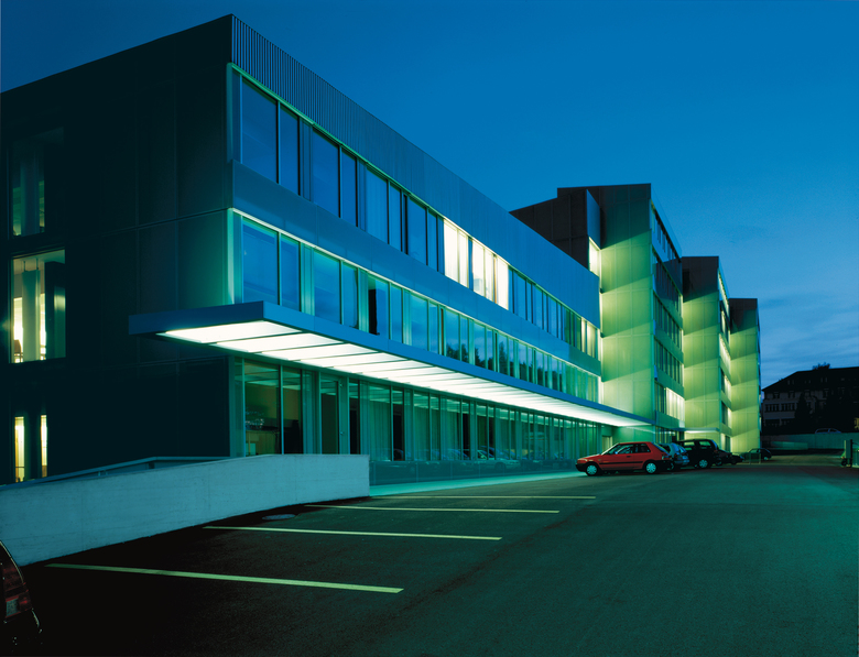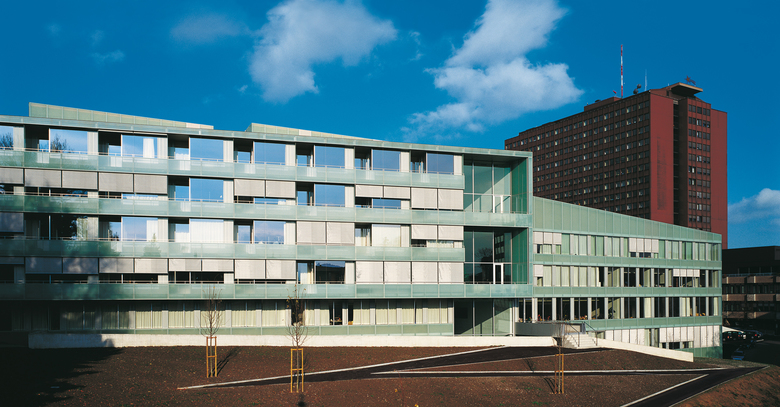 Die neue Frauenklinik ist ein freistehendes Gebäude in einer parkähnlich gestalteten Anlage. Der Zugangsbereich zum Spitalzentrum wird, mit der Setzung des Kopfbaues, als grosszügiger Platz und Gartenraum gestaltet, von welchem über eine elegante Aussentreppe und eine breite Rampe der Eingangsbereich der Frauenklinik mit weit ausladendem Vordach erreicht wird. Die Gestalt des Baukörpers schmiegt sich der Gelände-formation an und nimmt die zwei Bebauungsrichtungen der bestehenden Anlage auf. Die Gliederung der Form folgt definierten Funktionseinheiten: ein Kopfbau mit allgemeinen Einrichtungen und Behandlungsräumen, drei Türme mit Diensträumen und ein Bettentrakt. Die Volumen sind aussen durch eine einheitlich gestaltete Fassadenhaut zusammengefasst: transparentes Glas für die «Ausblickfenster», deckend emailliertes Glas für die Lüftungsflügel und dazugehörenden Rahmen, opak emailliertes Glas für die geschlossenen und teils lichtdurchlässigen Fassadenplatten. Durch die intensive Anwendung von Glas erhält der Baukörper einerseits einen Ausdruck von Leichtigkeit, im Innern andererseits ein Maximum an Licht.