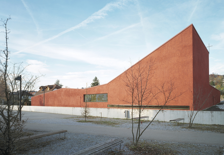 Eine heterogene Bebauung, bestehend aus niedrigen Einfamilienhäusern, mehrgeschossigen Mehrfamilienhäuser und einer Schulanlage, bestimmt die Atmosphäre des Ortes. Inmitten dieses Wohnquartiers soll das neue Kirchenzentrum gebaut werden. Das projektierte Gebäude setzt sich als Grossform zwischen die heterogene Bebauung und definiert dadurch seine Rolle als öffentliches und sakrales Gebäude im Quartier. Die Gebäudehöhen sind progressiv, von einer eingeschossigen Gestalt im Westen, angrenzend an die nachbarschaftliche Einfamilienhausbebauung bis hin zu einem zehn Meter hohen Abschluss, welcher den Kirchenraum beinhaltet und mit einer grossen Wand gegen Osten das Gebäude abschliesst. Das neue Kirchenzentrum vereint in einem Komplex verschiedene Raumbereiche: Sakralraum mit Foyer und Gruppenräumen, Verwaltung und Wohnung und zwei Jugendräume. Ihnen vorgelagert, befinden sich pro Einheit eigens definierte Aussenräume in Form von Innenhöfen. Dadurch entsteht, trotz der Heterogenität der Bebauung im Quartier und den verschiedenen Wohnaussenbereichen der angrenzenden Häuser, eine der Nutzung des Zentrums adäquate Aussenbereichsituation: Ein Hof für die Aktivitäten der Jugend, ein Aussenraum für die Gemeinschaft der Kirche und ein Garten für die Wohnung.