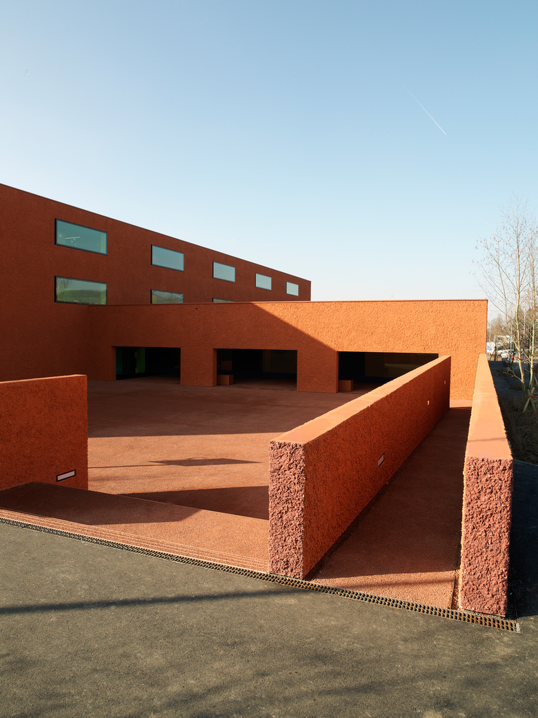 Jeder Trakt besitzt eigene gedeckte Zugänge und weist zu angrenzenden Volumen und Aussenräumen gedeckte Verbindungen auf. Diese Gliederung erhöht im Zusammenspiel mit dem inneren Farbkonzept die Identifizierbarkeit der Räume und erleichtert die Orientierung im Schulhaus und die Auffindbarkeit der Unterrichtseinheiten.