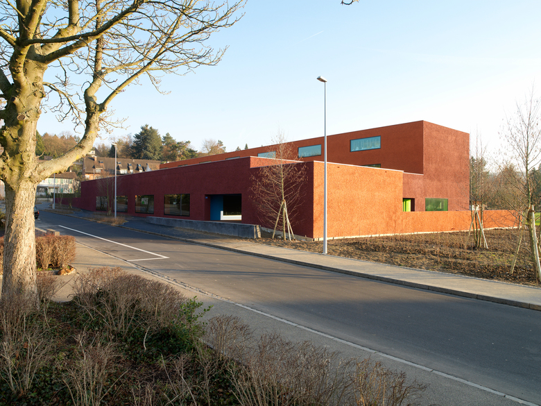 Das Projekt reagiert auf den Massstab des Quartiers mit einer Komposition aus drei Volumen, einem höheren für die Klassenräume und zwei niedrigeren für Turnhalle und Velos, welche etappen- und funktionsweise zusammengeschoben sind. Die Anordnung der drei Baukörper und die in Querrichtung eingeschobenen gedeckten Verbindungshallen generieren verschieden artikulierte Pausenhöfe, welche der Primarschulanlage trotz ihrer Grösse eine angemessene Massstäblichkeit verleihen. Das Farbkonzept der grob verputzten Fassaden erhöht die räumliche Prägnanz der definierten Höfe und steigert die Plastizität der Anlage.