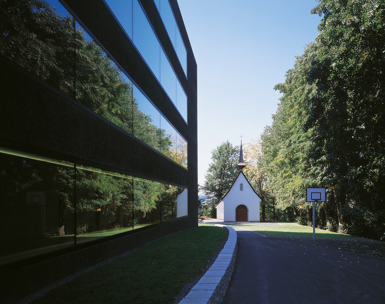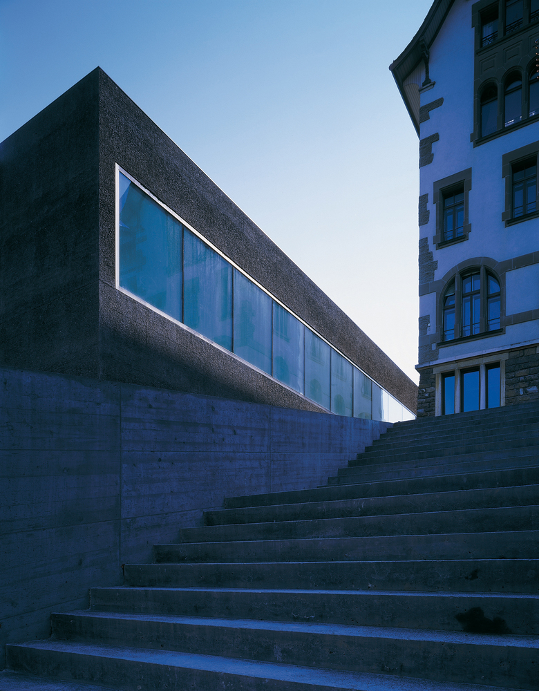Das alte Schulhaus «Villa Thérèse», ein umgenutztes Pensionat aus der Jahrhundertwende, wurde um vierzehn Unterrichtsräume für die Primarschule, vier Kindergartenklassen und eine Doppelturnhalle erweitert. Die drei neu in den Park eingefügten Einzelvolumen mit je unterschiedlicher Nutzung wurden um das bestehende Schulhaus gruppiert. Im Gegensatz zum rauen äusseren Ausdruck ist das Innere der drei Gebäude geprägt durch feine Oberflächen und das mit einem Künstler entwickelte Farbkonzept. Die drei Neubauten reagieren in ihrem inneren Aufbau auf die jeweilige Beziehung zum Park und zu den anderen Gebäuden. Das Primarschulhaus besteht aus einer Abfolge von Räumen unterschiedlicher Orientierung: zum zentralen Platz, zum südlichen Wiesenhang, in die Baumkronen oder zum historischen Stadtkern mit dem Turm der Kathedrale als Wahrzeichen. Beim Kindergarten wird der parallel zum Hang liegende Erschliessungs- und Pausenraum von der quer dazu verlaufenden Aufreihung der Klassenzimmer überlagert. Das Volumen der Turnhalle ist hangseitig zur Hälfte ins Terrain abgesenkt. Darüber erlaubt die sich auf die ganze Hallenbreite erstreckende Verglasung den Blick durch die gegenüberliegende Verglasung hindurch in die Hügellandschaft.