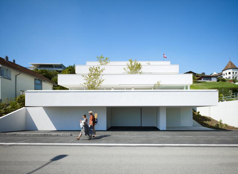 Räumlich zeigen sich die Wohnungen als fliessender Innenraum, welcher vom Eingang zum Wohn- Essraum bis hin zur grosszügigen Ankleide vor dem Elternzimmer sich entwickeln und zum begrünten Aussenraum mit Ausblick auf den See und die Berge sich orientieren. Die Materialisierung des Gebäudes ist charakterisiert von einer durchgehenden Gestaltung der Fassaden mit weissem Kratzputz, von weiss einbrennlackierten Fensterdetails und Brüstungsgeländern. Im Innenraum herrschen warme Materialien vor, wie Eichenbretterparkett und mit Kastanienholz furnierte Einbauschränke und Küchenfronten. Die Wand- und Bodenbeläge in den Bädern sowie auf den Terrassen sind mit grossformatigen Travertinplatten belegt. Die Anlage weist vier Geschosse auf, welche im Erdgeschoss den Hauszugang mit Briefkasten, Container, Fahrradeinstellplätze sowie acht Autoparkplätze aufweist. Die drei Vier-Zimmerwohnung mit grosszügigen Terrassen werden über einen internen Aufzug von der Garage direkt erschlossen oder können auch von aussen über eine Freitreppe im Garten erreicht werden.