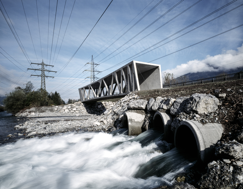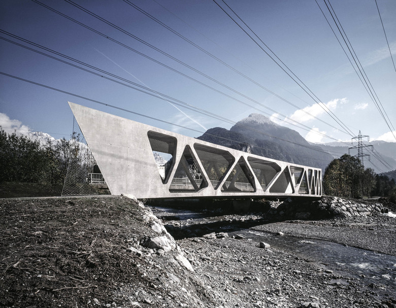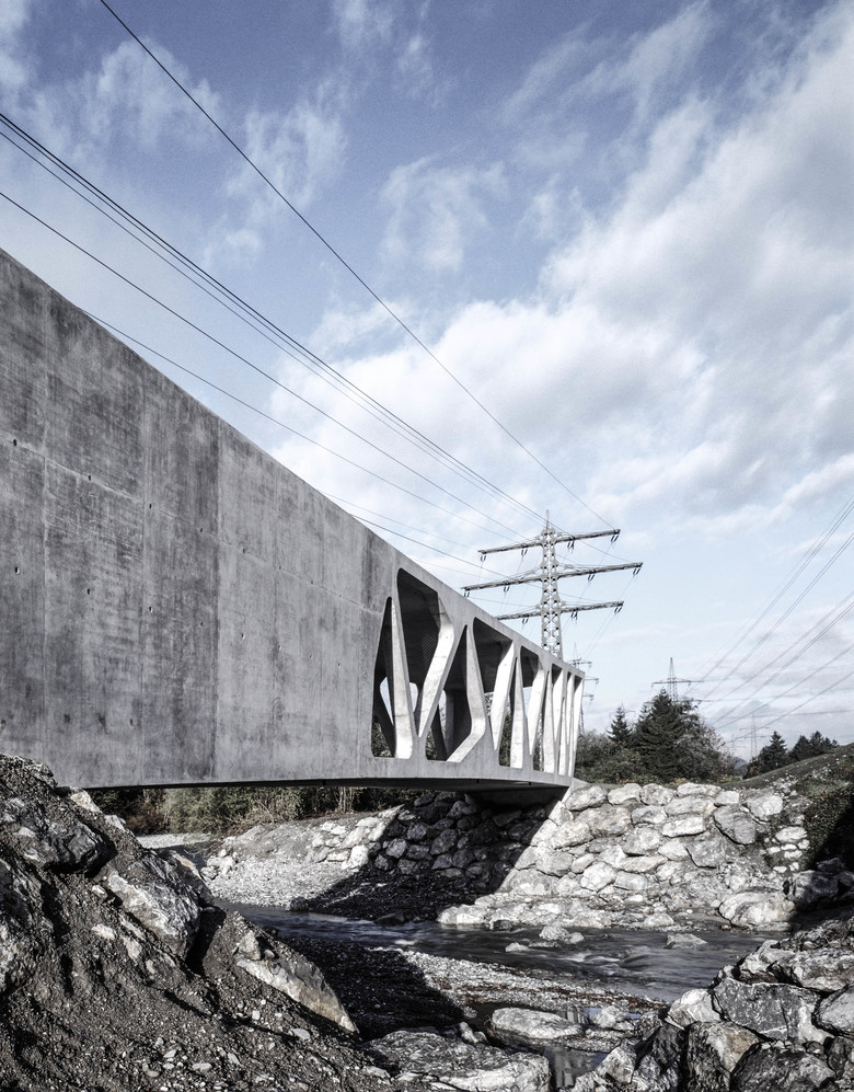 Der stark befahrenen Straße wird durch mehr Wandanteil Rechnung getragen, zur Ill hin eröffnet das aufgelockerte Fachwerk den Blick zum Naturraum. So reagiert die statische Wandscheibe mittels unterschiedlich großen Öffnungsanteilen auf Umgebungseinflüsse und Auflagerkräfte. Charakter und Gesamterscheinung resultieren dem zu Folge aus statischer Logik und Effizienz in der Materialisierung. Die Radwegverbindung Bludenz-Schruns wird im wahrsten Sinne des Wortes „massiv“ aufgewertet, denn die Brücke setzt durch ihre gestalterische Prägnanz einen kaum zu übersehenden Meilenstein im Netz der autofreien Mobilität.
